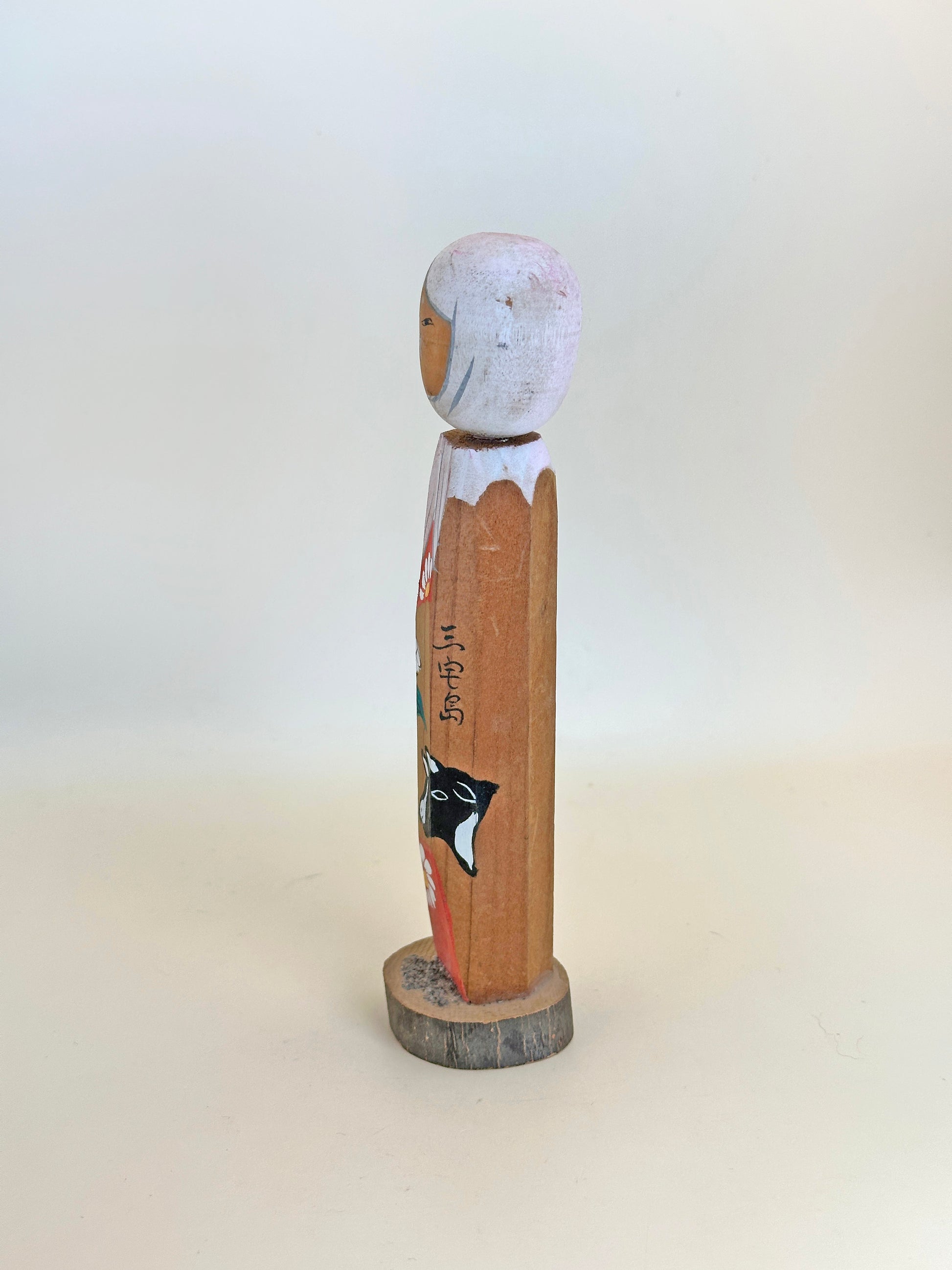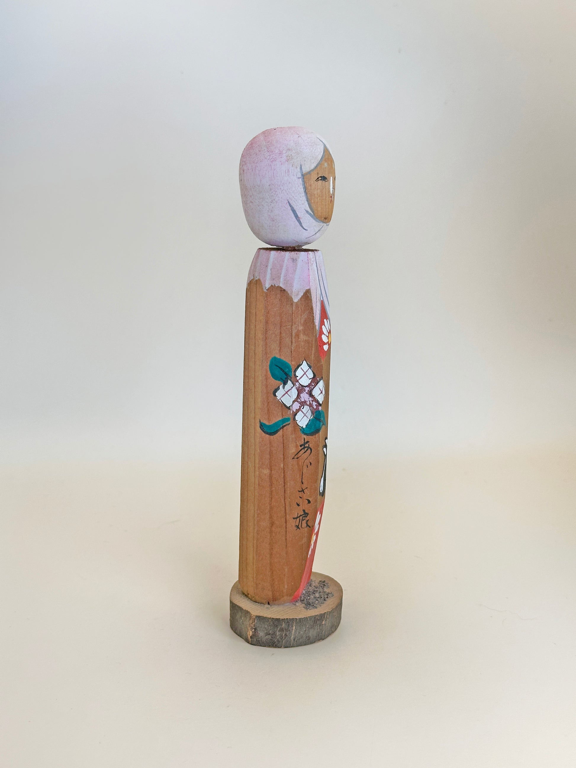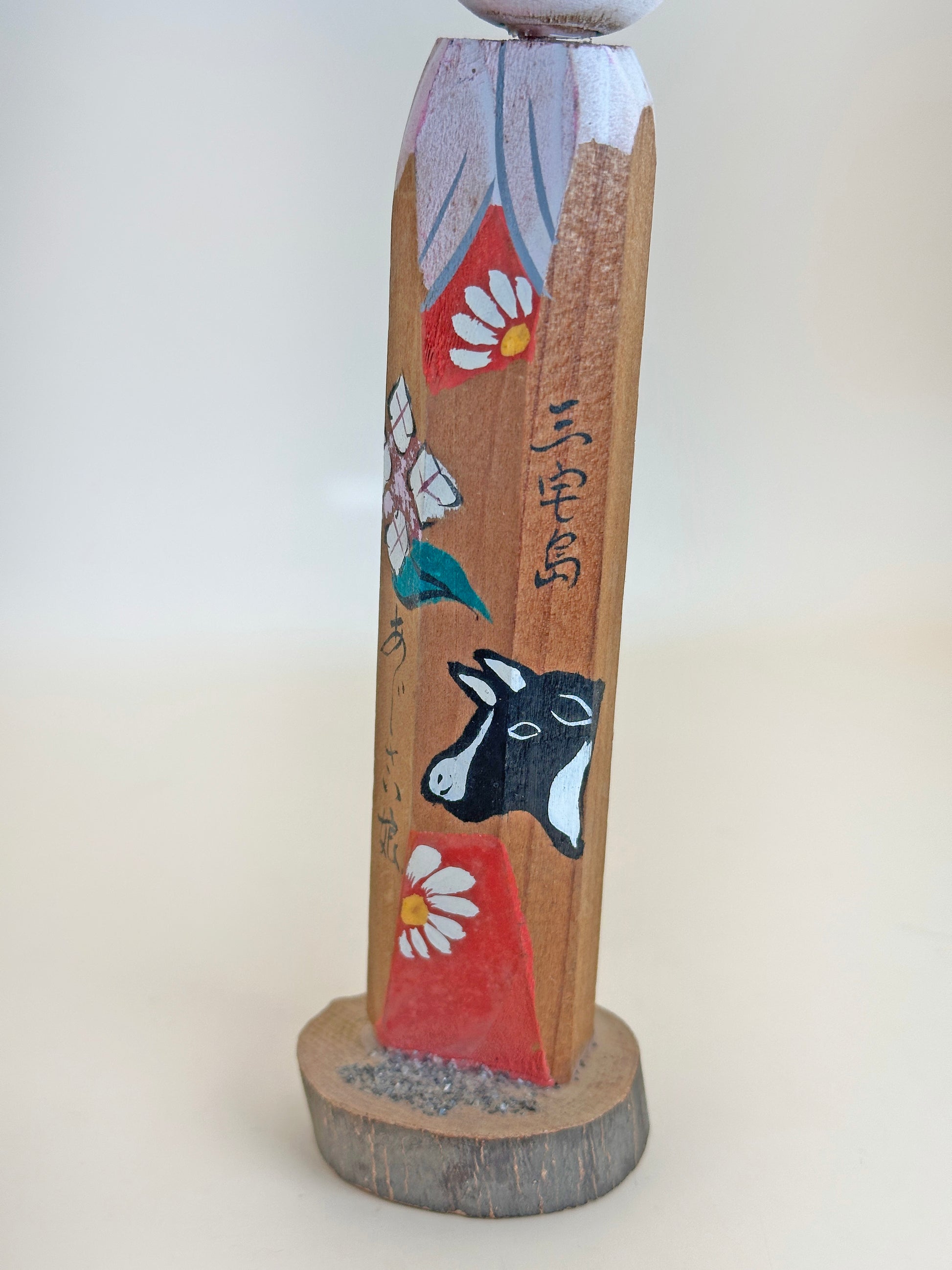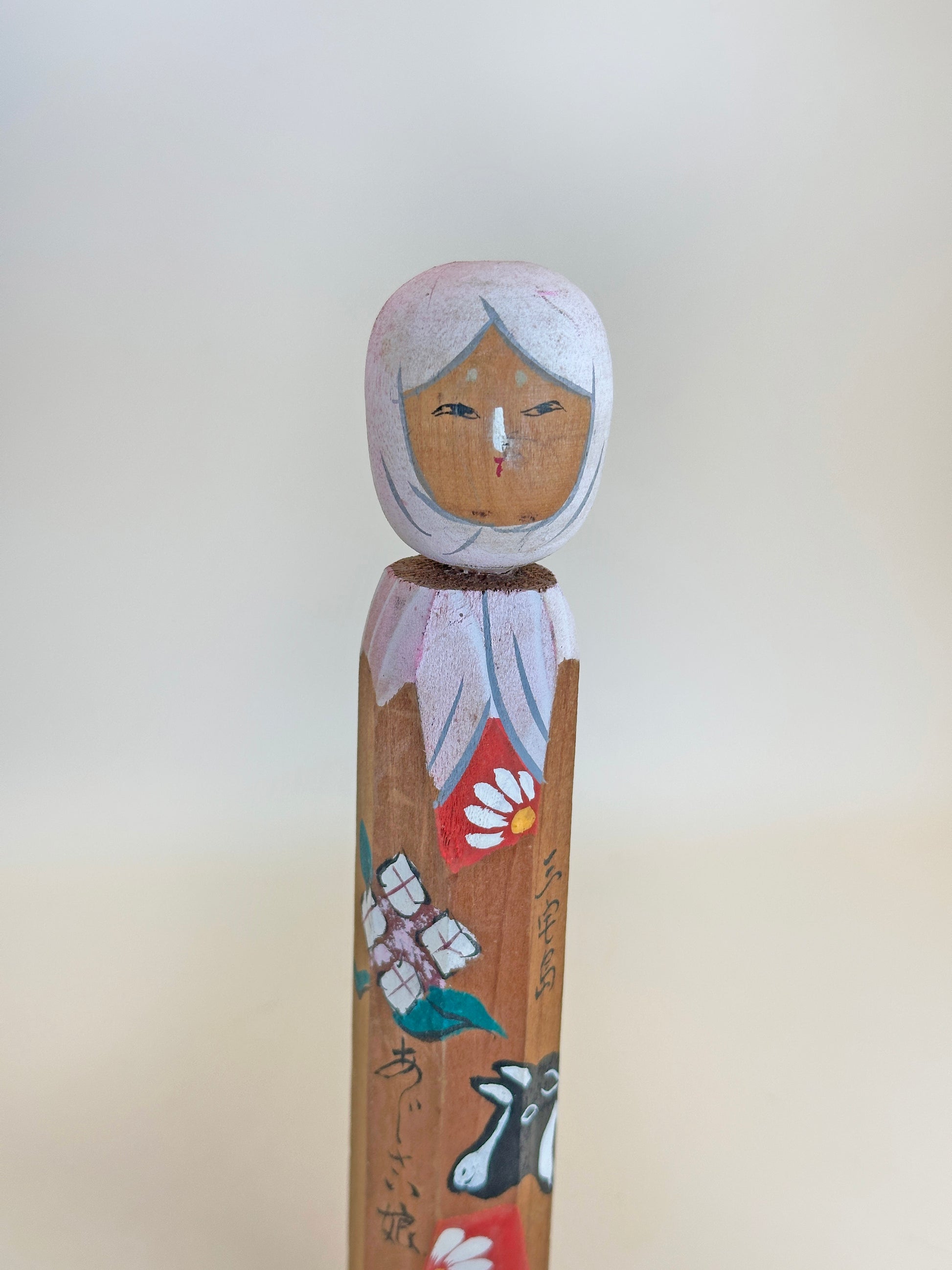 This omiyage kokeshi doll from Miyakejima (三宅島) is titled “Ajisai Musume” (あじさ娘), meaning Hydrangea Girl. Standing on a natural wood base, this slender wooden figure is hand-painted with soft, delicate details that reflect the natural beauty and agricultural culture of this volcanic island in the Izu archipelago.