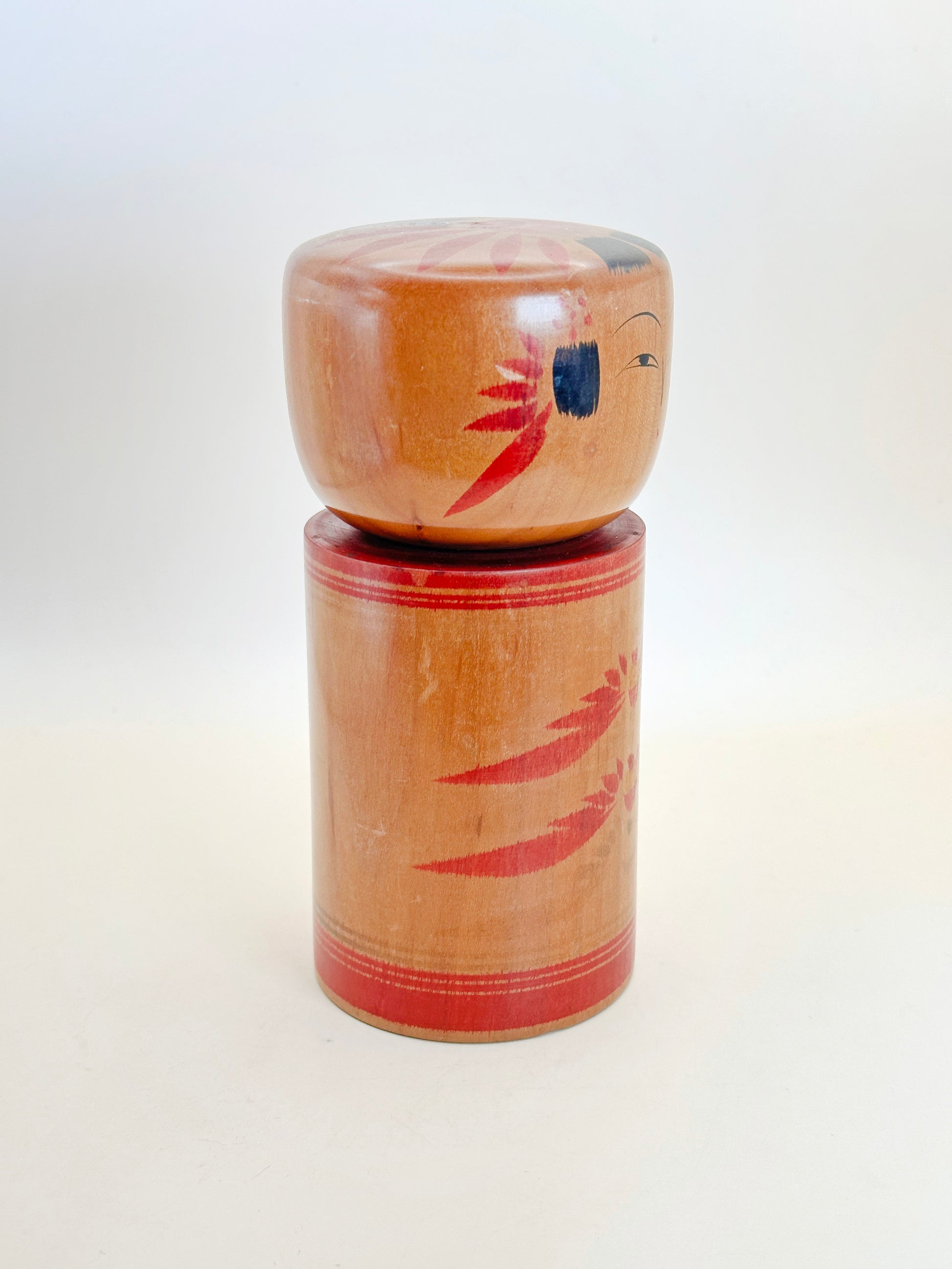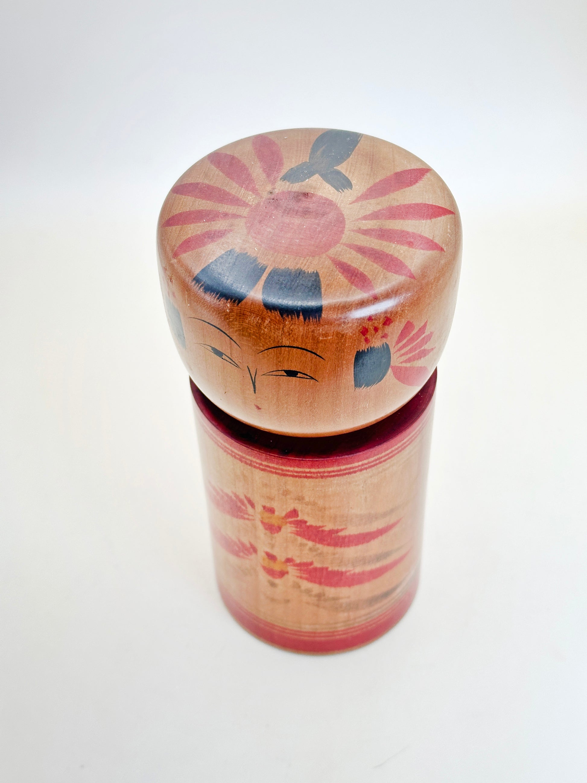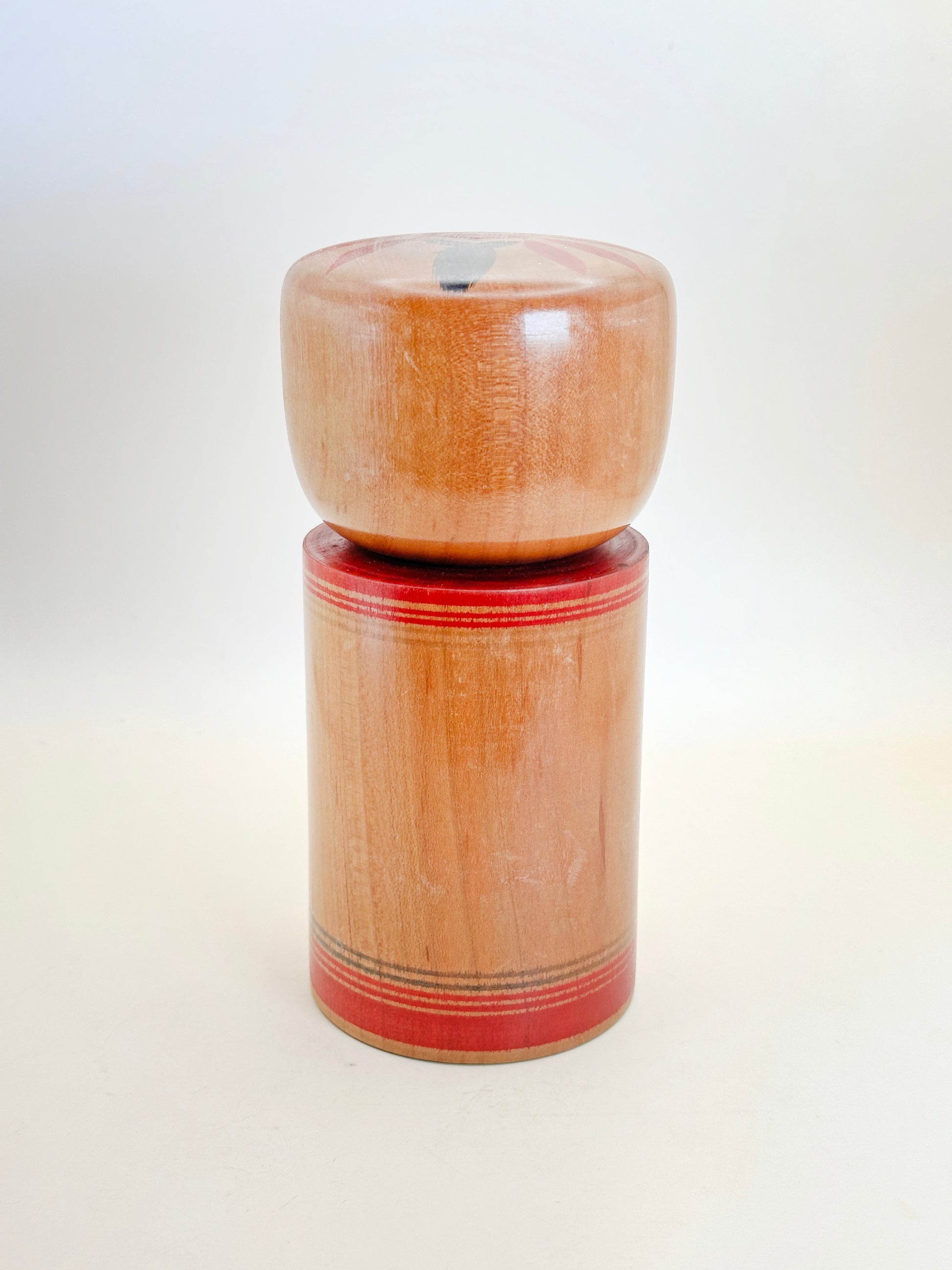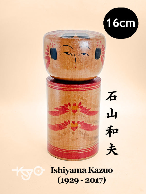 This is a traditional Zao-style kokeshi crafted by Ishiyama Kazuo (石山和夫, 1929–2017), a renowned artisan whose work helped bridge the classical roots of kokeshi with the expressive spirit of the postwar creative movement. Measuring 16cm in height, this charming piece embodies the distinct features of the Zao lineage, known for its compact, cylindrical body and large, flat-topped head.