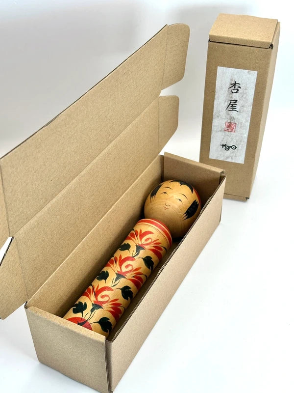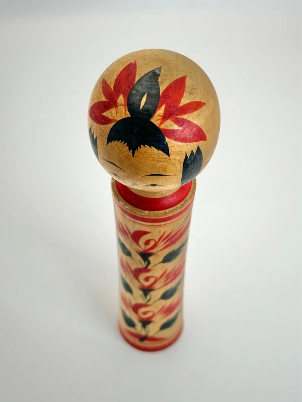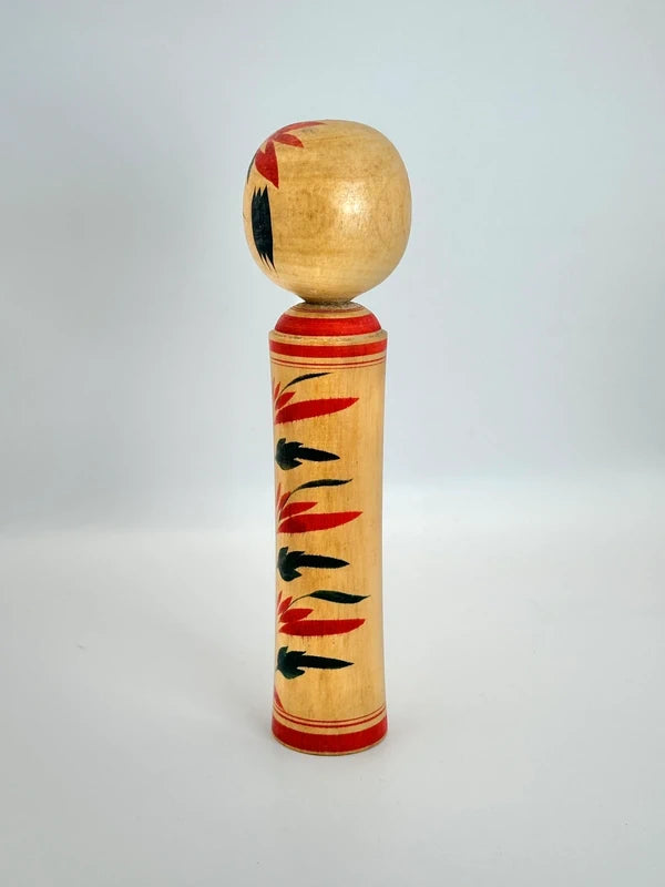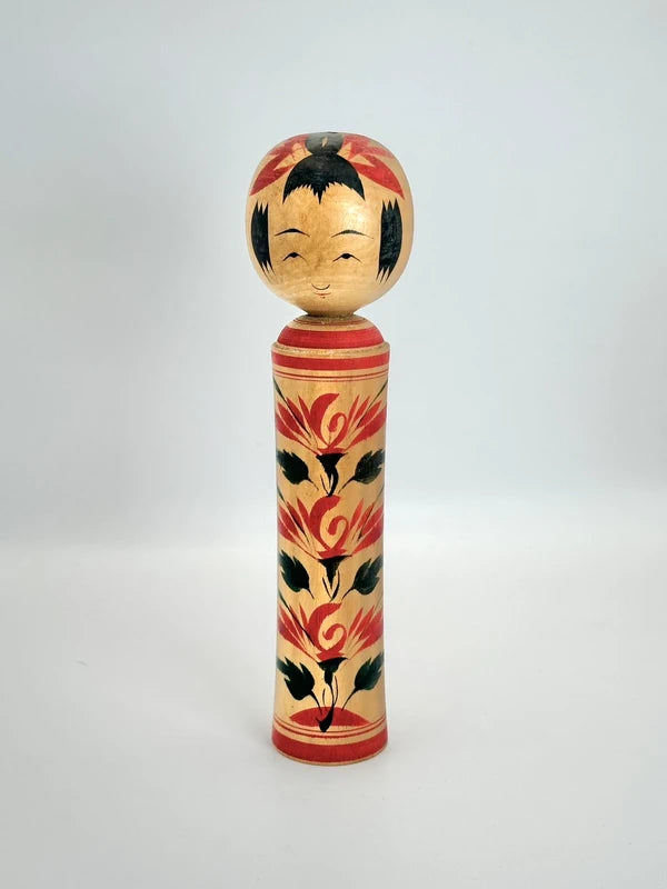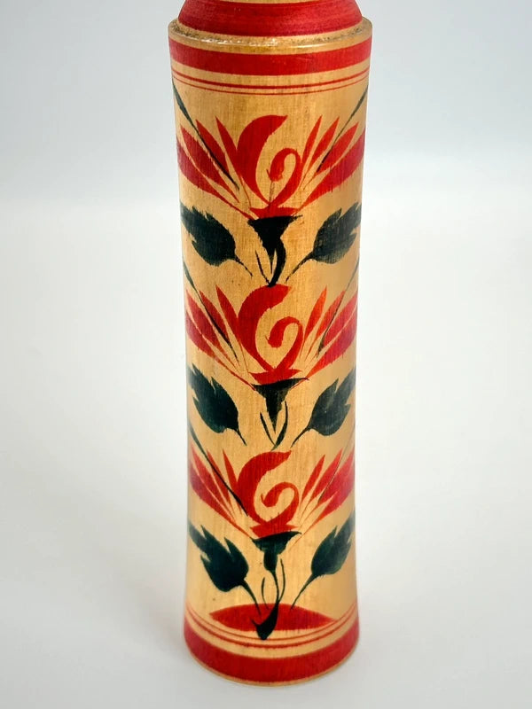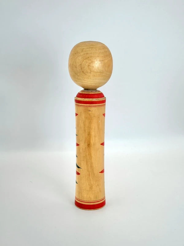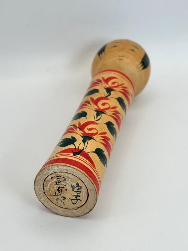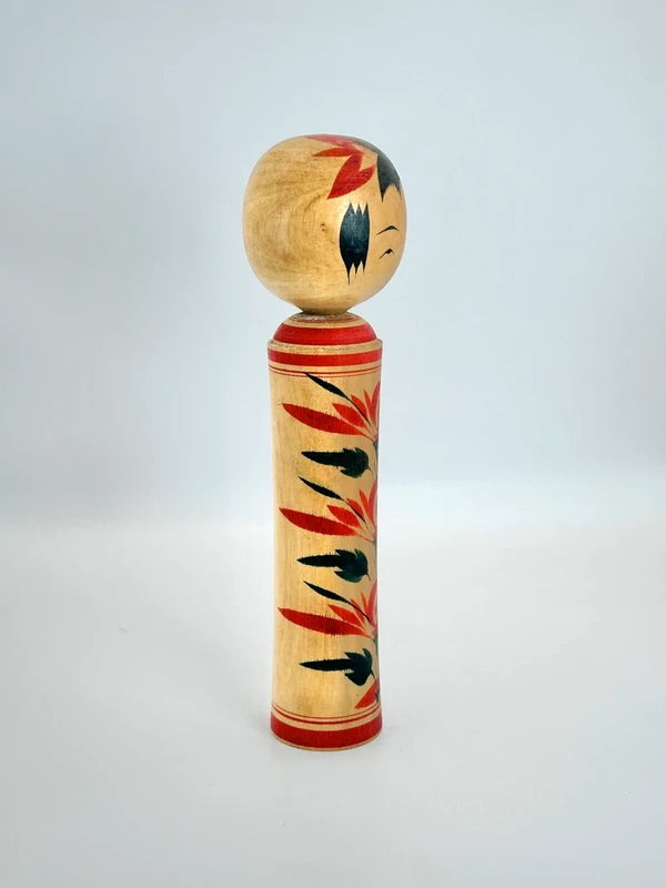 A Naruko kokeshi is a vibrant and beautifully balanced piece crafted by Takahashi Yoshinao, a second-generation artisan from the renowned kokeshi-making region of Naruko in Miyagi Prefecture. The doll embodies all the classic traits of the Naruko tradition symmetry, vivid brushwork, and a timeless sense of serenity.