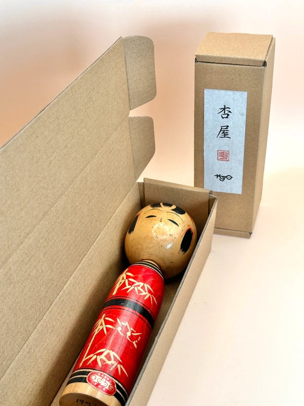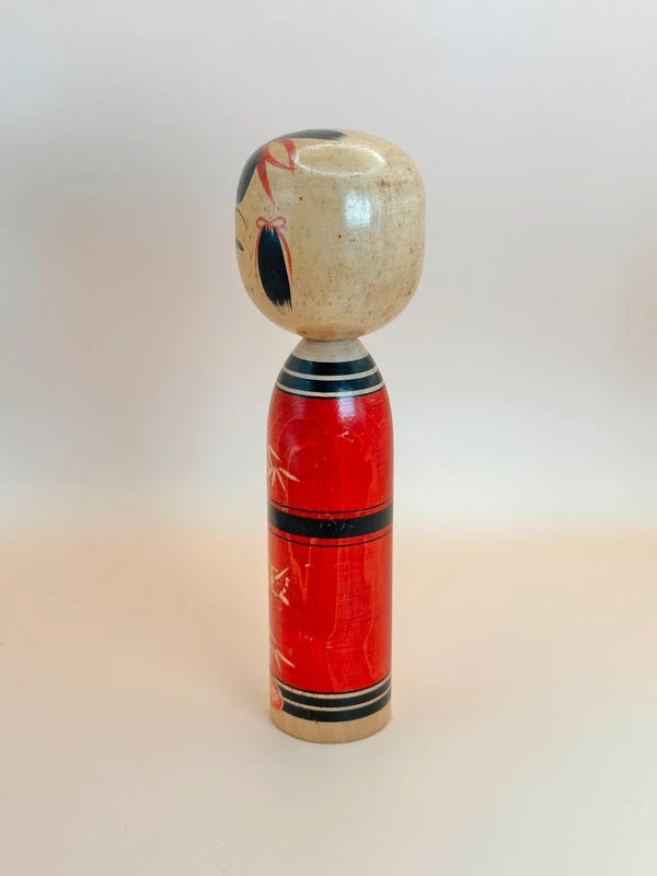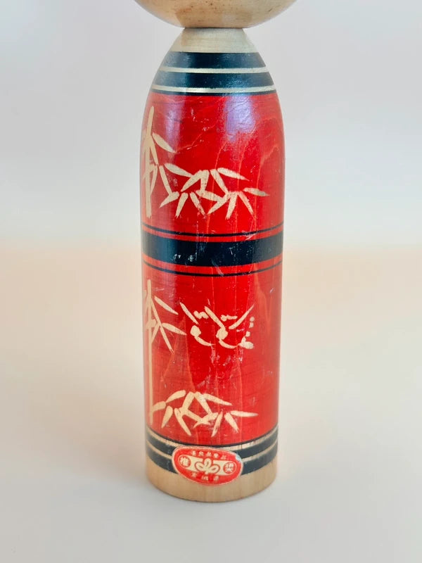 The doll features a vivid red-painted body, decorated with graceful golden bamboo leaves, a symbol of resilience and prosperity in Japanese culture. The bamboo motif is repeated on both upper and lower sections of the body, framed by elegant black banding. The head is adorned with a sweet and classic expression, arched eyebrows, crescent-shaped eyes, and a small mouth, painted with precision. Delicate red hair ribbons accentuate the side locks of her hairstyle, enhancing the traditional feminine charm.