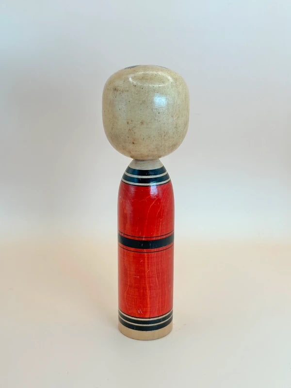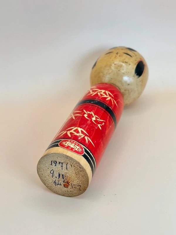 Sosaku kokeshi handcrafted by Kawamura Shoji (川村昭治), a skilled artisan known for his bold and graphic approach to traditional kokeshi forms showcasing a perfect balance of vibrant color and clean brushwork. It also holds historical significance as an award-winning work, as indicated by the original red prize tag sticker still affixed to the base.
