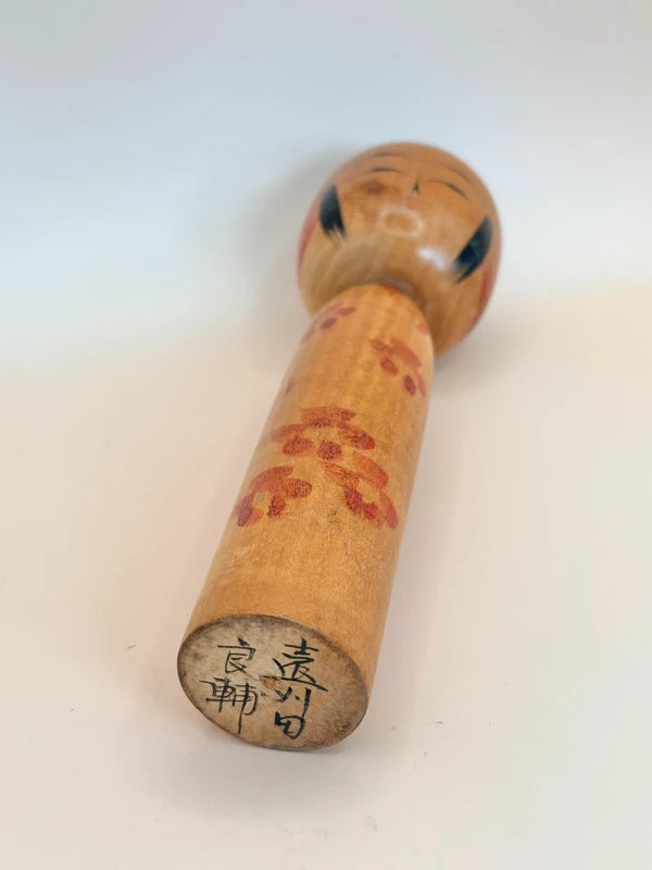 A Togatta-style kokeshi by Ryosuke Saito, featuring a classic form with refined hand-painted details. The doll’s face exudes charm with its narrow eyes and gentle smile, framed by thick black side hair and a crown of red petal motifs atop the head. The cylindrical body is lightly adorned with small red floral motifs, rendered with subtle, delicate strokes that echo the quiet elegance of traditional Togatta craftsmanship.