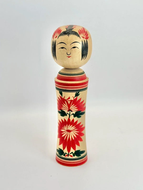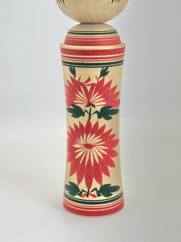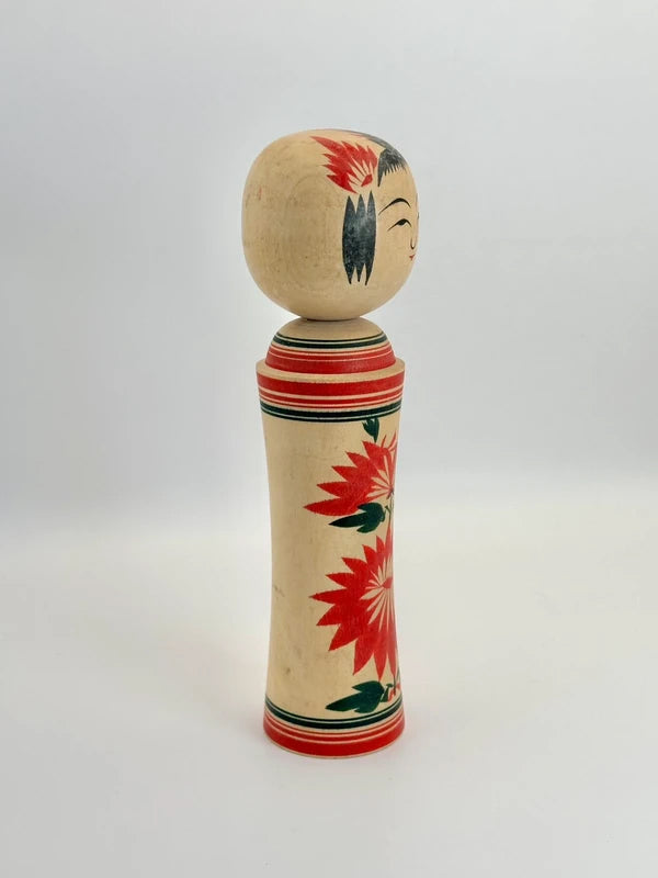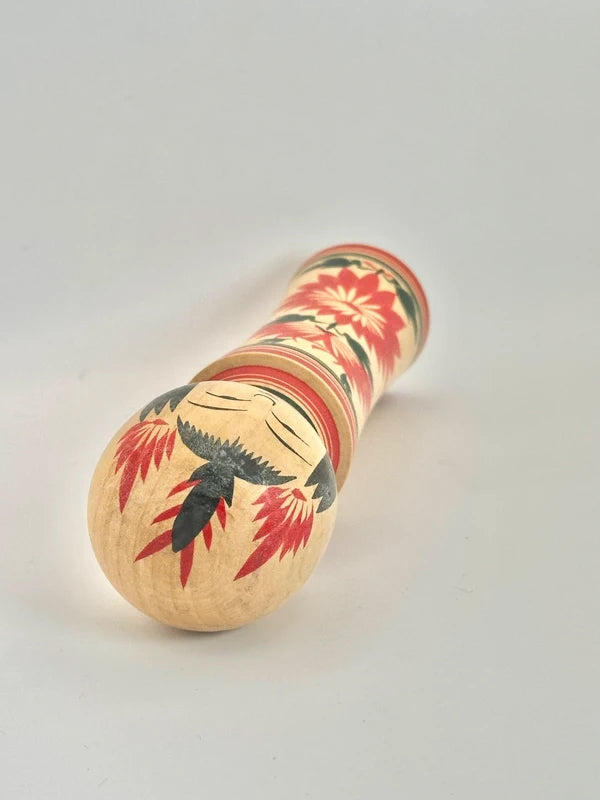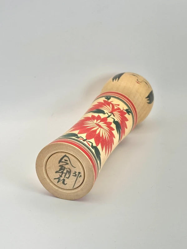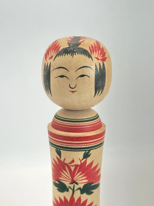 A gently tapered body with a rounded head, featuring the classic structure of Naruko dolls. Vibrant red chrysanthemums with lush green leaves decorate the body—an iconic Naruko motif, symbolizing vitality and beauty. Finely drawn hair adorned with floral elements—typical of Koyama’s warm and welcoming style.