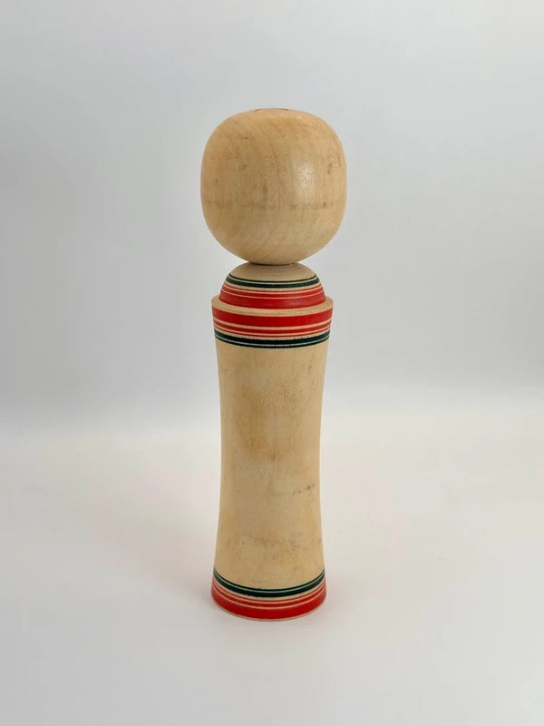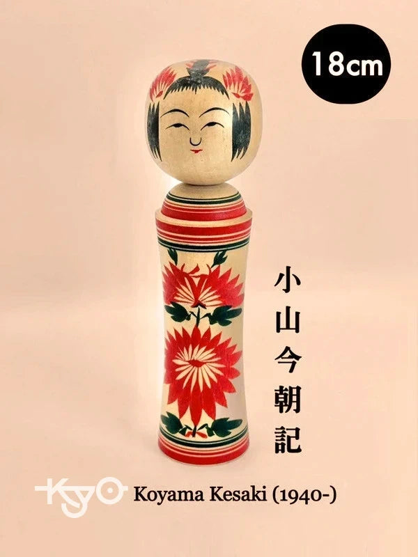 As common with Naruko dolls, the head can slightly turn and produce the characteristic "kiki" squeak sound, a delightful feature of this tradition. About the Artist – Koyama Kesaki (1940–): Born in 1940, Koyama Kesaki is known for his faithful dedication to Naruko kokeshi techniques, combining bright, cheerful colors with expert woodturning skills. His work is particularly appreciated for its balance between tradition and artistic individuality. He remains a respected figure among collectors and admirers of Japanese folk art.