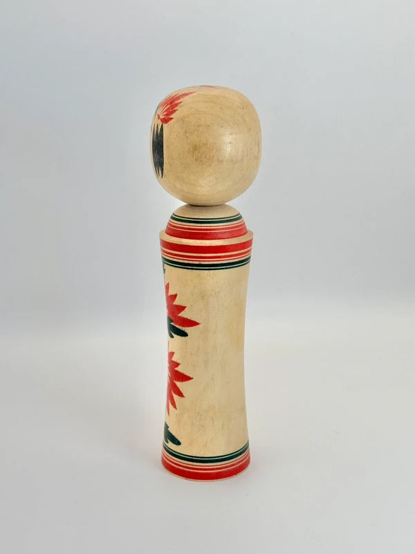 A perfect condition of a vintage Naruko-style kokeshi doll. It was crafted by Koyama Kesaki, an esteemed artisan born in 1940, celebrated for his bright and detailed work within the Naruko kokeshi tradition. Originating from Naruko Onsen in Miyagi Prefecture, Naruko kokeshi are famous for their refined forms, lively paintings, and distinctive craftsmanship.