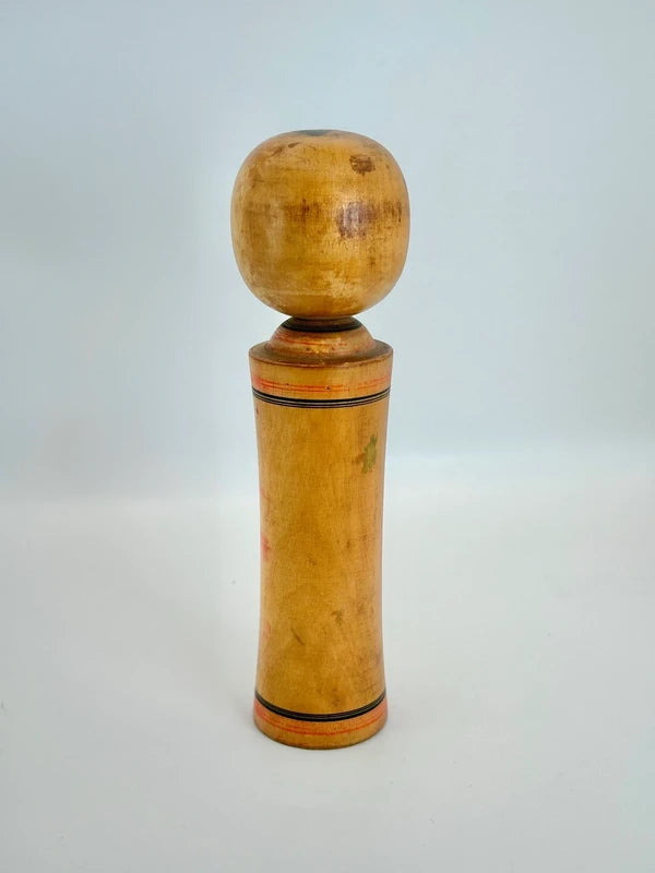 A Naruko kokeshi created by Akira Goto, a respected artisan of the Naruko tradition renowned for his delicate expressions and warm brushwork. With its classic form and soft personality, this doll reflects the enduring appeal of Naruko kokeshi both as artistic craft and cultural heritage. The doll features a traditional Naruko silhouette: a broad, rounded head with a slightly flared cylindrical body. Its face is painted with gentle half-moon eyes, thin eyebrows, and a small, sweet smile giving the kokeshi a serene and content expression. The hair is rendered in a bold “helmet” style with a stylized topknot, a hallmark of the Naruko lineage.