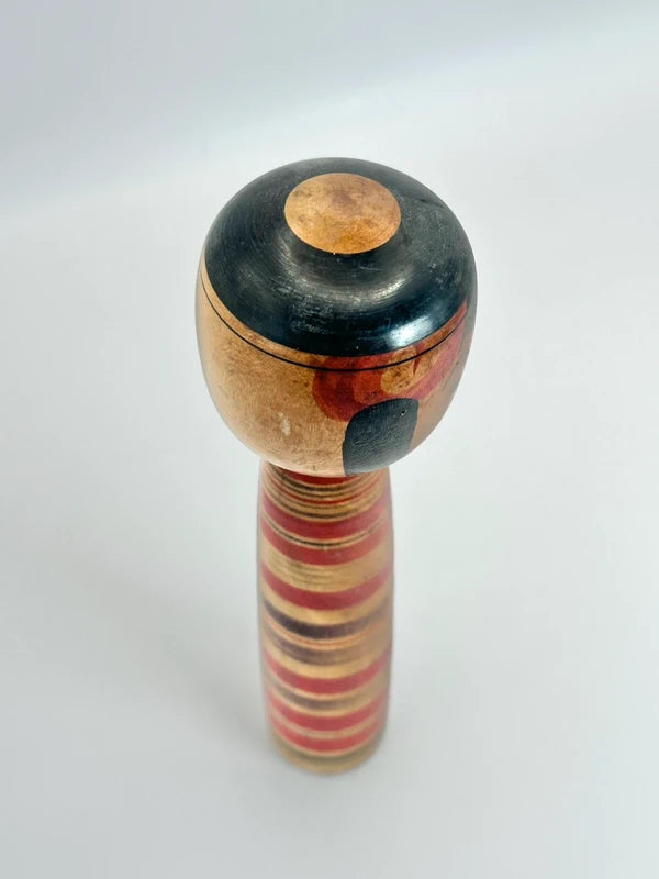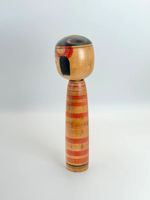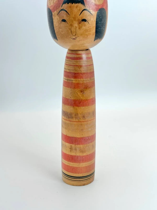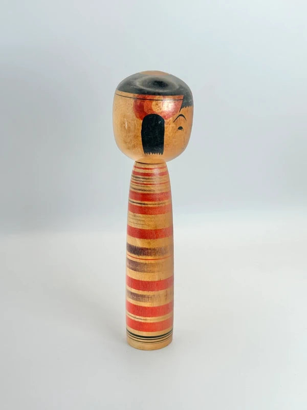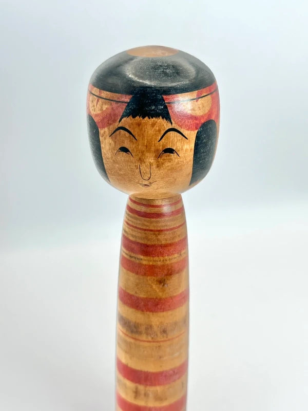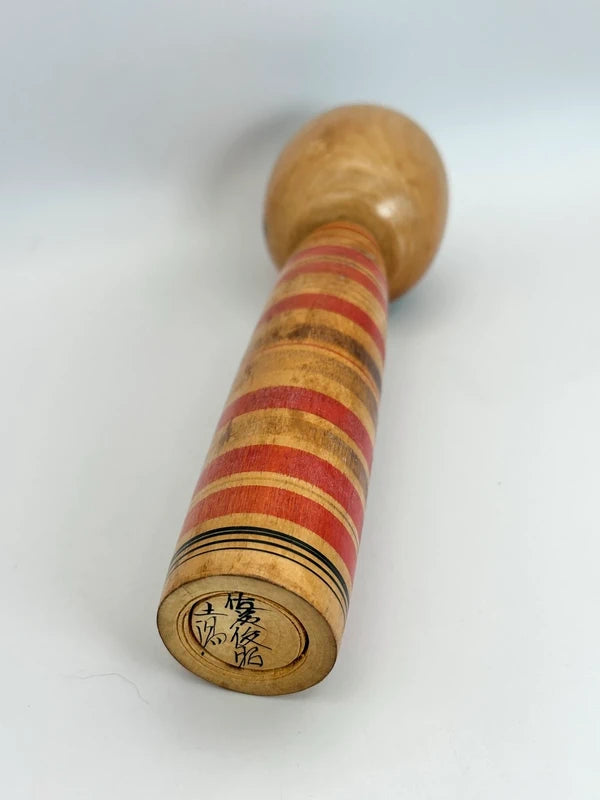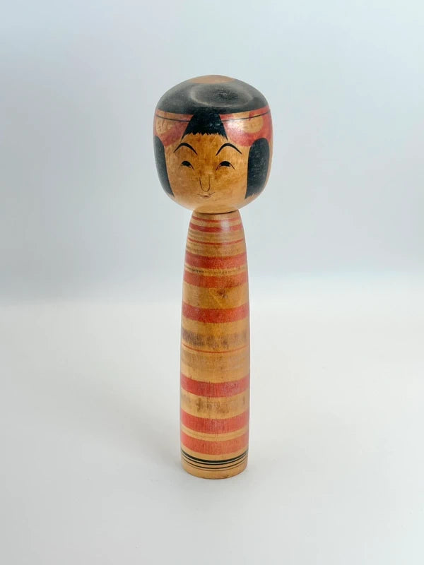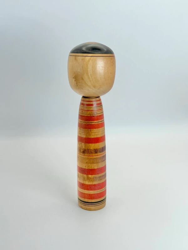 A Tsuchiyu kokeshi is the work of Sato Toshiaki (佐藤俊昭, 1930–2009), a skilled craftsman from Fukushima Prefecture who carried forward the traditional Tsuchiyu lineage. The doll features a characteristic Tsuchiyu silhouette—tall, slender, and gently tapering toward the base with rhythmic horizontal striping that wraps around the body in alternating shades of red and dark brown, evoking a sense of motion and balance.