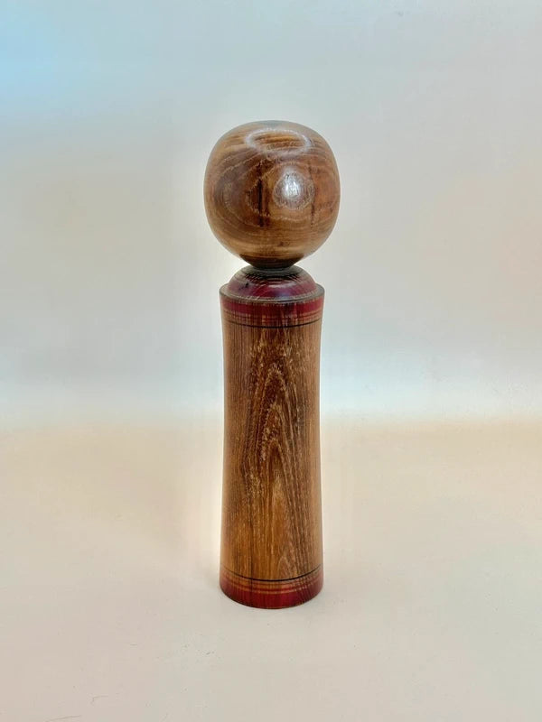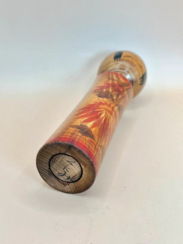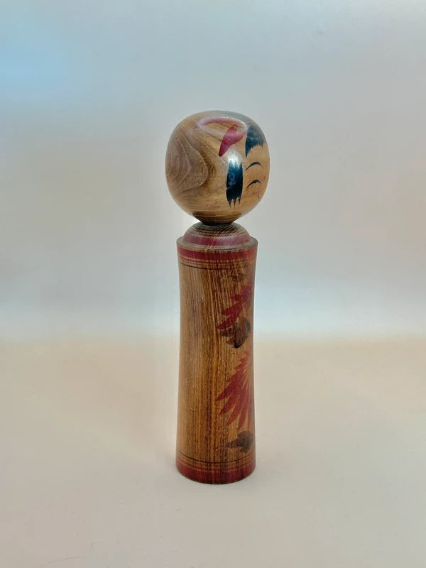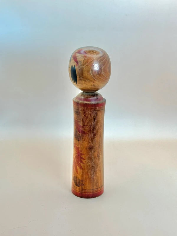 A Naruko kokeshi by the late artisan Kunimi Sugawara (菅原くにみ, 1948–2003) True to the Naruko tradition, the doll features a cylindrical body, a round head and a distinct red decorative ring at the neck hallmarks of this style.