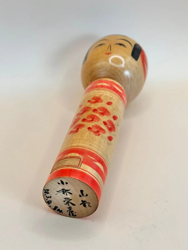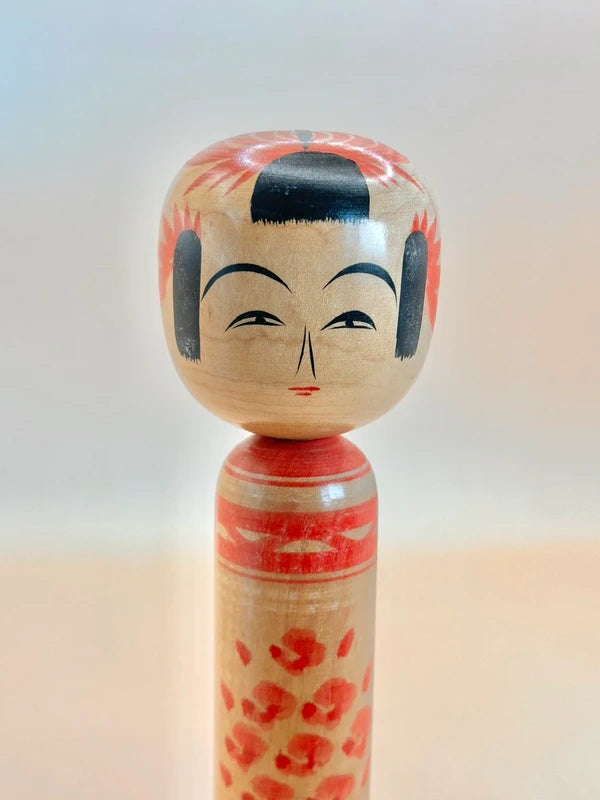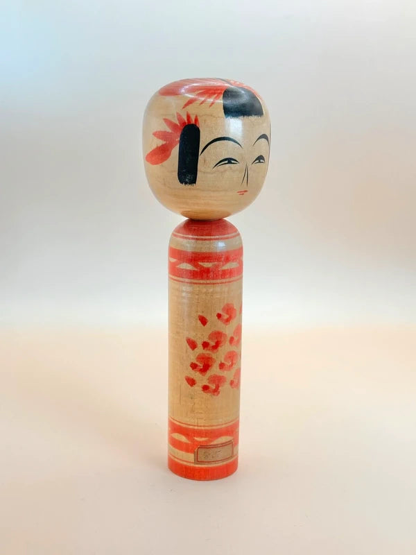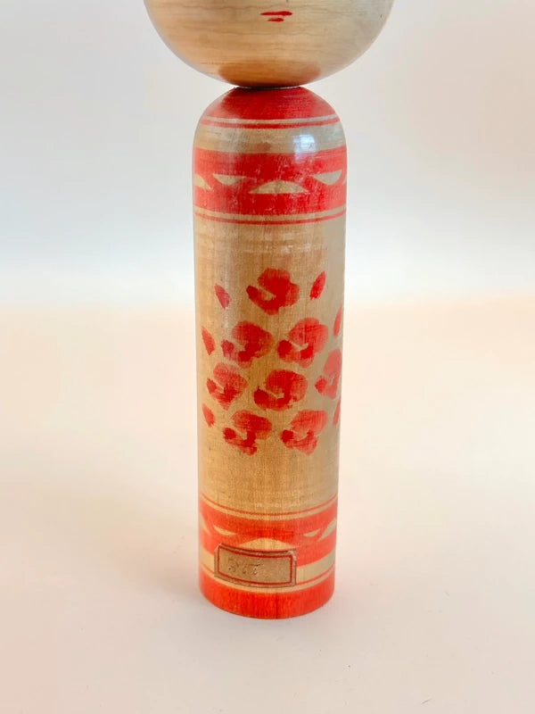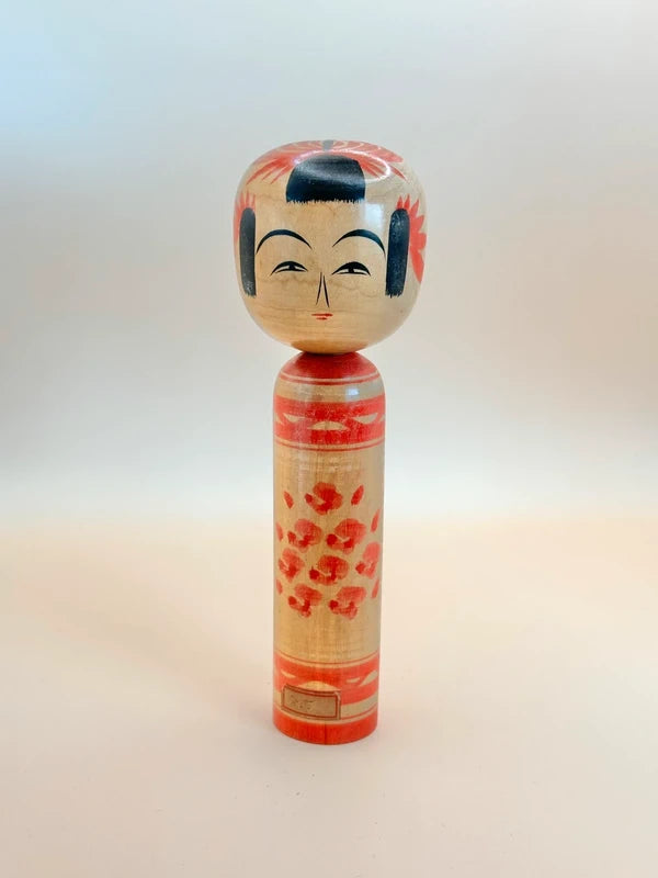 A Yamagata-style kokeshi by Eizo Kobayashi (小林栄蔵, 1907–1998) is a refined example of mid-century craftsmanship rooted in one of Japan’s most distinct regional kokeshi traditions. The doll features a soft, serene expression with upward-curving almond eyes, delicately arched brows, and a small, composed mouth. Her smooth cylindrical body is adorned with bright clusters of stylized red blossoms, arranged in a gentle diamond formation that adds liveliness to the otherwise minimalistic silhouette.
