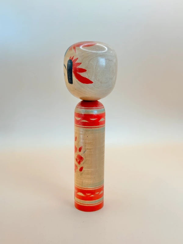 At the crown of her head, a large chrysanthemum motif blooms in vibrant red and black, radiating from a central hairline, a hallmark of Yamagata kokeshi. The proportions are perfectly balanced, with subtle red rings framing both neck and base. The piece carries a sense of timelessness and quiet strength an archetype of the Yamagata aesthetic with its neat, symmetrical design and restrained charm.