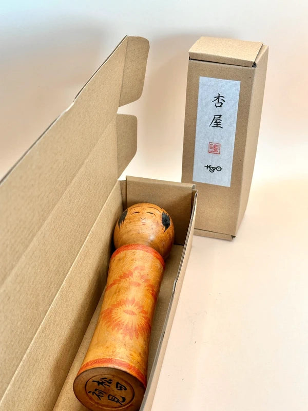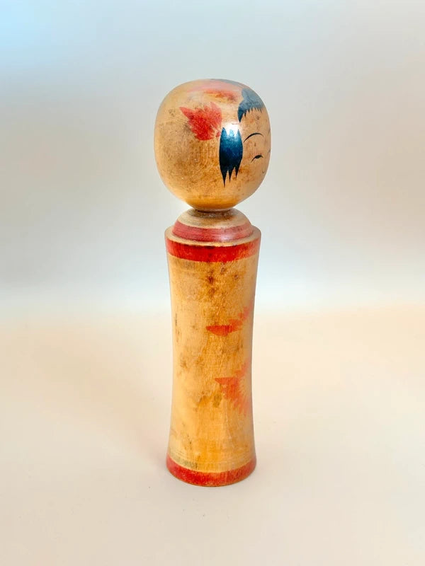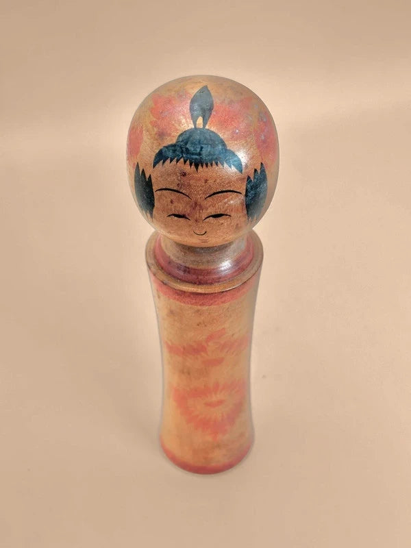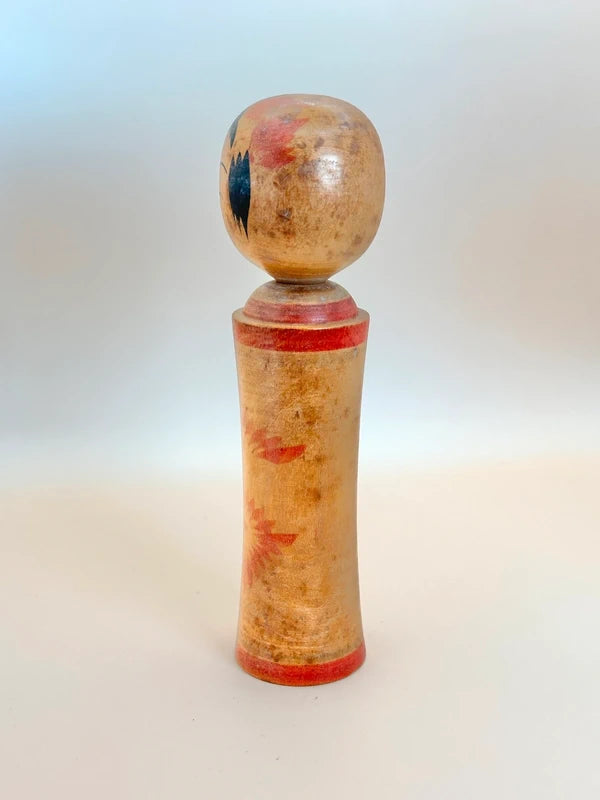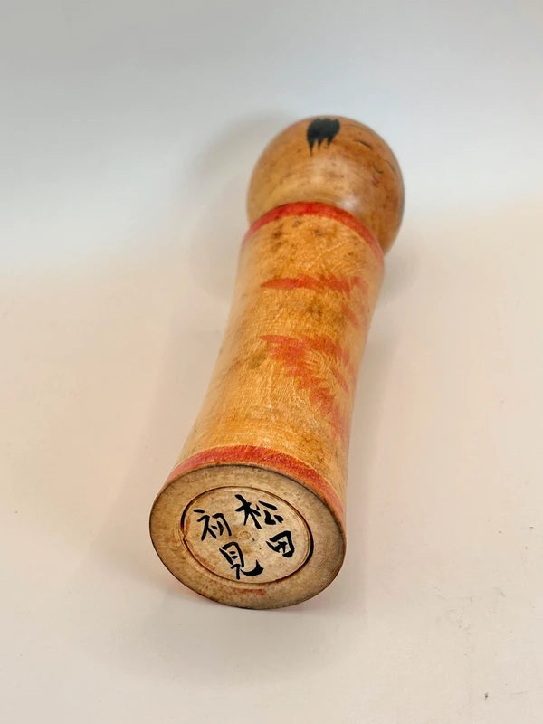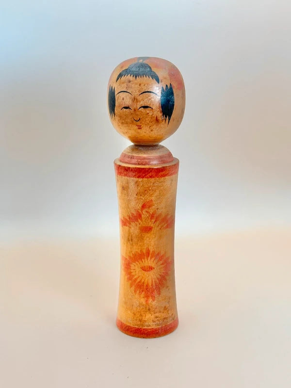 A Naruko-style kokeshi was crafted by master artisan Matsuda Hatsumi 松田初見, one of the key post-Meiji period kokeshi makers of Naruko Onsen. The doll features the classic Naruko silhouette with its gently curving body, prominent neck ring, and rounded head. Its serene expression is framed by distinct side-parted hair, and the face is adorned with fine, balanced brushstrokes. The body is decorated with characteristic sunburst chrysanthemum patterns in rich reds and soft orange tones, slightly faded with time, adding to its nostalgic charm.