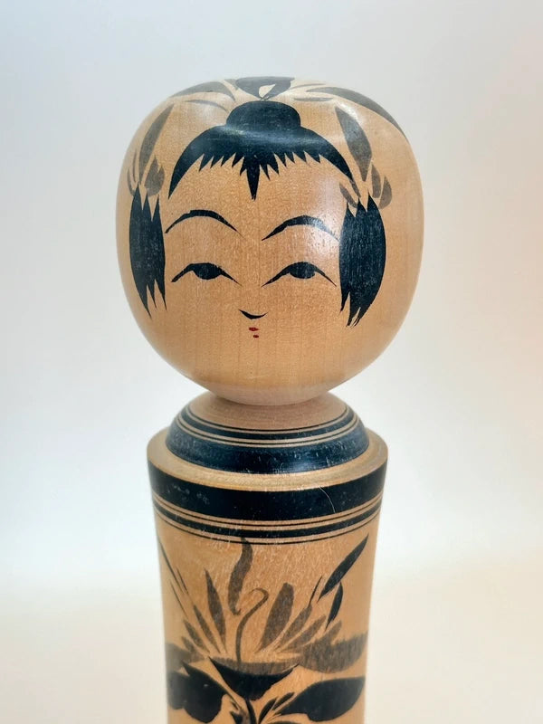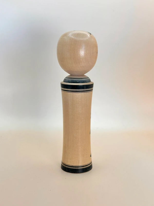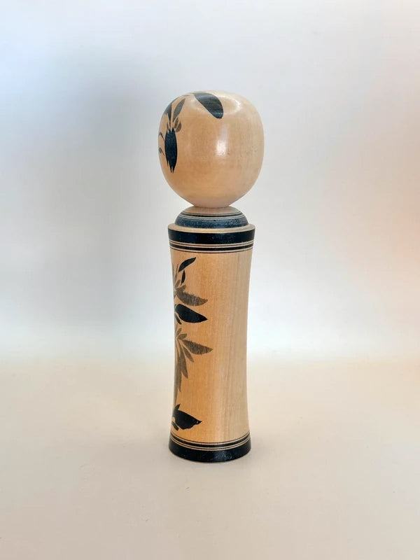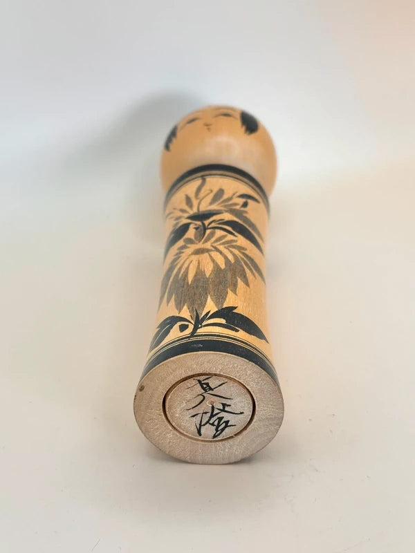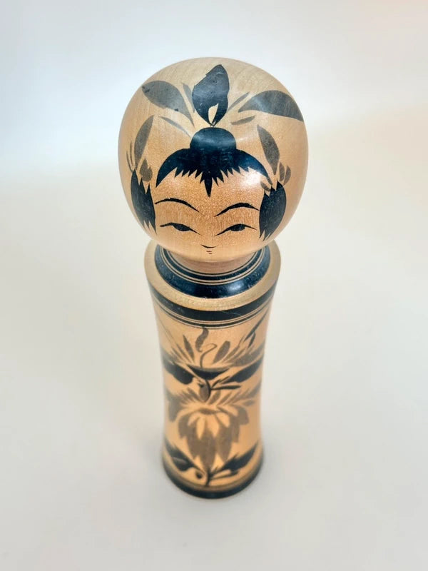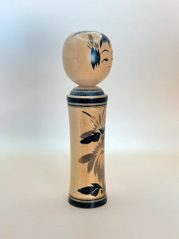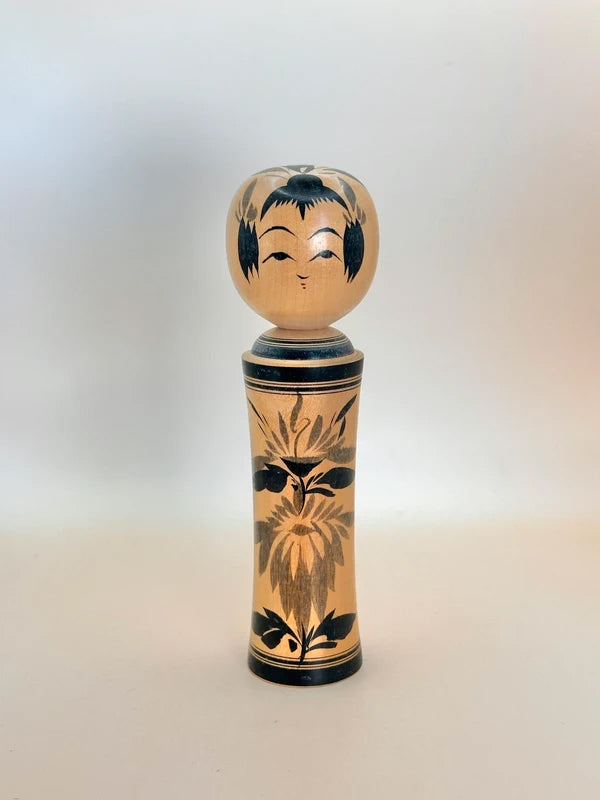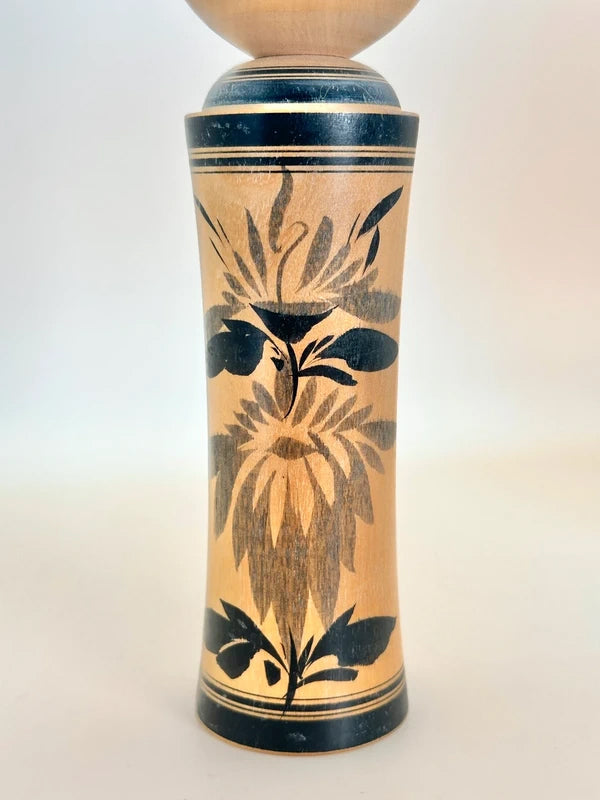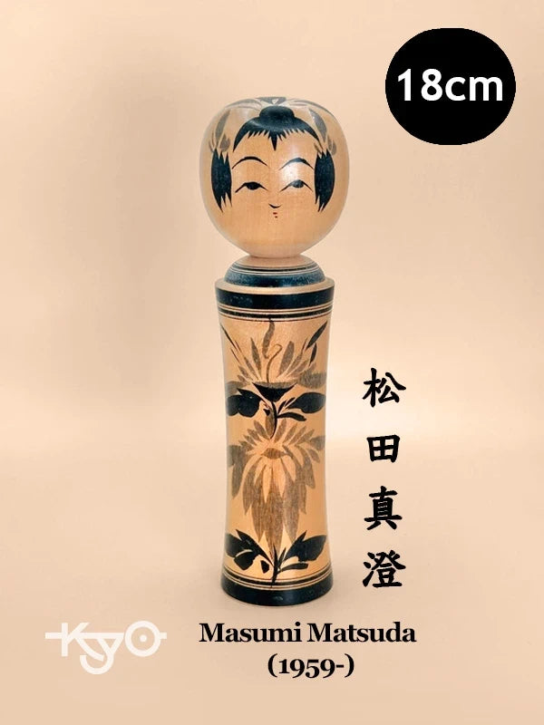 A kokeshi by Masumi Matsuda represents the Naruko-kei tradition, one of the most iconic and recognizable schools of kokeshi-making. The doll is beautifully turned with a slender, flared body and a soft, polished surface that highlights the natural wood grain. Painted in classic black sumi-e brushwork, the body is adorned with a striking floral motif, typically chrysanthemums or peonies, rendered in bold, detailed strokes. A thick double black band borders the top and bottom of the body, enhancing the sense of formality and elegance.