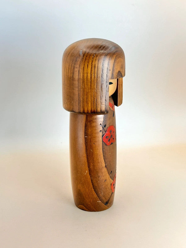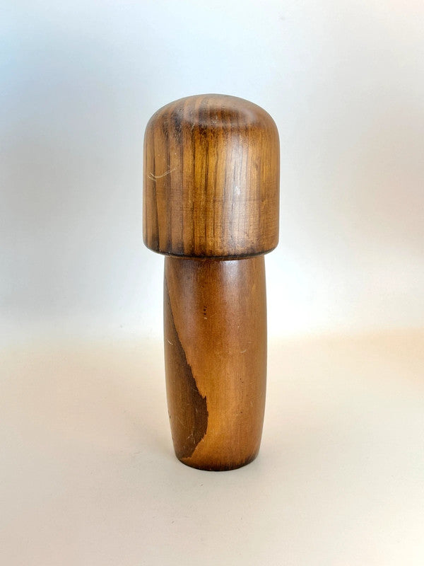 Usaburō Okamoto born in a Shinto village, Okamoto moved to Tokyo at the age of 15 to train in metalworking before returning to his hometown post-war. With this technical background, he introduced mechanical techniques and innovative aesthetics into kokeshi craftsmanship, departing from the constraints of traditional forms. He often used chestnut and other rare woods, and developed a unique pyro-engraving technique using heated wire to burn intricate patterns into the wood.