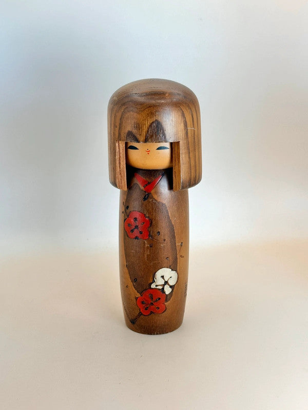 A sōsaku kokeshi doll storage case created by the renowned artist Usaburō Okamoto (岡本卯三郎, 1917–2009) a master known for revolutionizing modern kokeshi with his inventive, design-driven approach. Crafted with a warm, polished wood tone features a minimalist face, serene expression, and a charming plum blossom motif on its body.