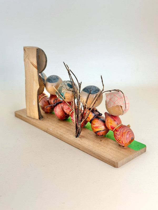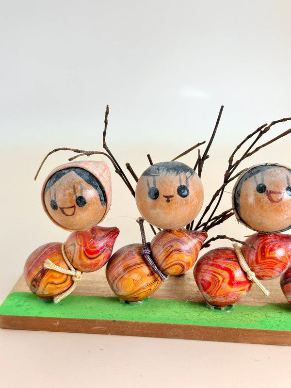 The dolls are arranged playfully in a row, with twig-like arms reaching out toward one another, conveying a sense of camaraderie and joy. Some wear tiny fabric hoods, adding to their individuality and charm. The marbled patterns in warm tones of red, orange, and gold give the gourds a vibrant, almost fiery appearance, creating a visual warmth that complements their happy expressions.