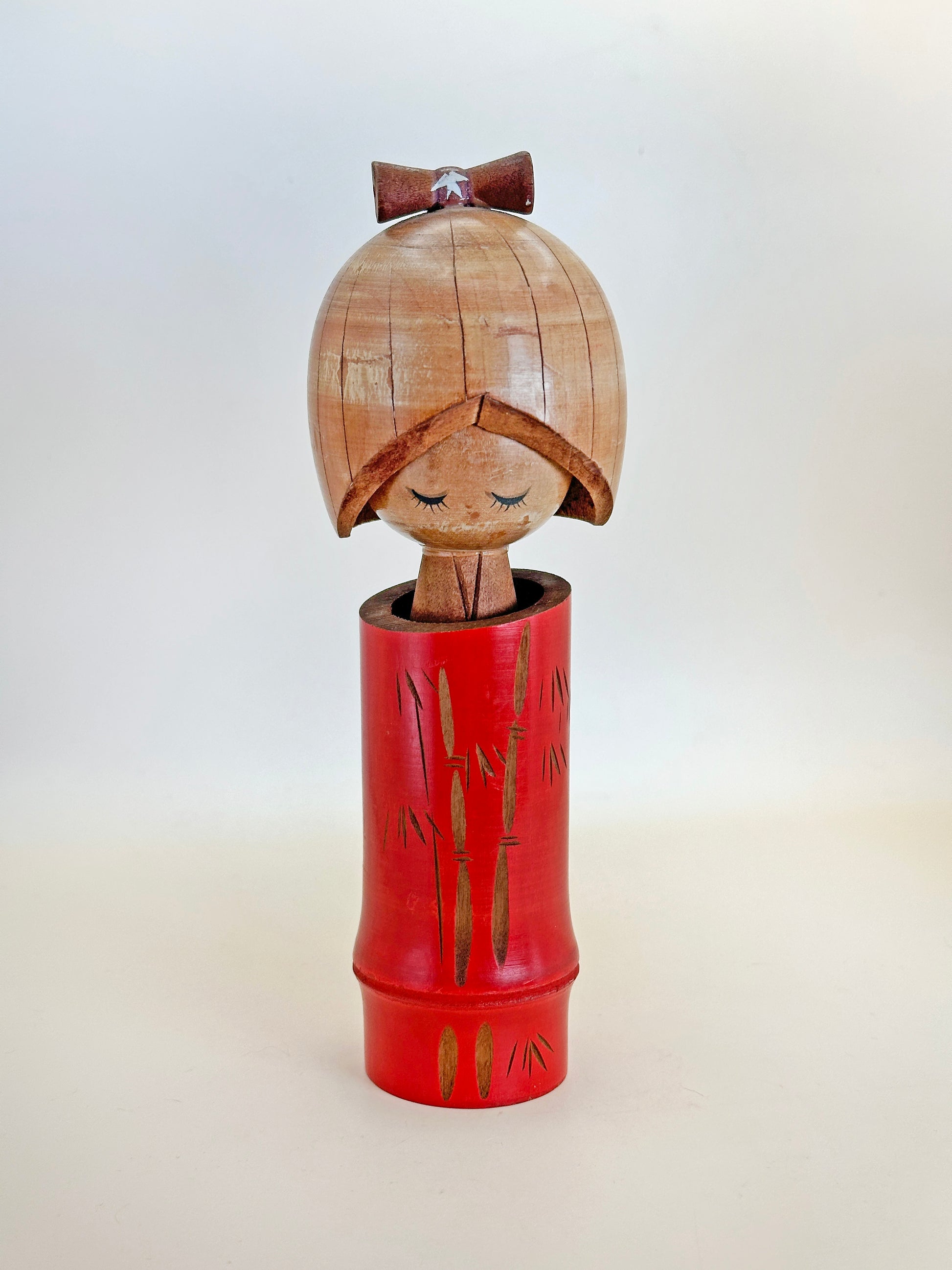 Her expression is serene and introspective, with eyes gently closed and a faint smile that suggests calm contentment. The artist has carved her hair into smooth, rounded layers framing her face, topped with a small wooden bow that adds a playful yet delicate charm. The cylindrical body is lacquered in a rich crimson tone and carved with a bamboo motif (竹) a symbol of strength, purity, and endurance in Japanese culture. The vertical lines of the bamboo pattern accentuate the doll’s slender form, while the red lacquer evokes vitality and auspicious energy.