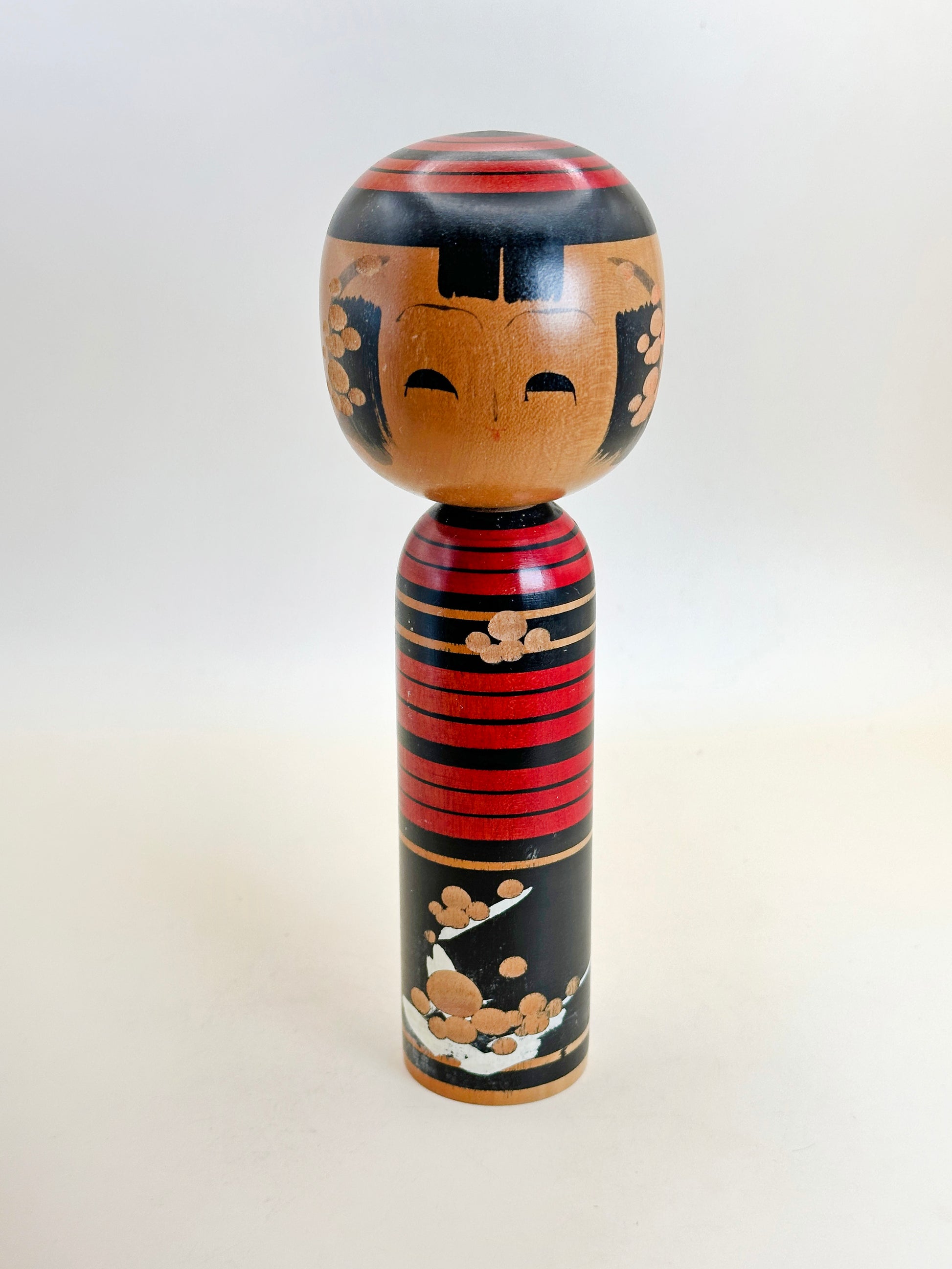 Sasaki’s work is instantly recognizable for its polished precision and his mastery of lacquer-like finishes that give depth and luminosity to his color compositions. The gold floral accents and geometric striping draw influence from both traditional kimono textile patterns and modern graphic design — a reflection of the Shingata Kokeshi (“new-style kokeshi”) movement, which emerged during Japan’s mid-20th-century modern craft renaissance.
