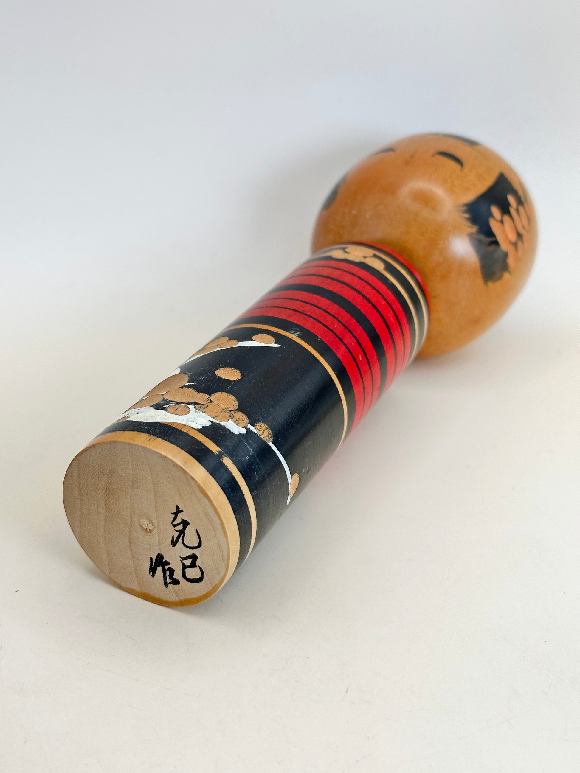 This Sōsaku-Shingata Kokeshi by Sasaki Katsumi (佐々木克己, 1928–2008) beautifully captures the evolution of postwar Japanese design, blending the warmth of traditional form with bold modern aesthetics. The doll radiates both elegance and character through its refined craftsmanship and rich color palette.
