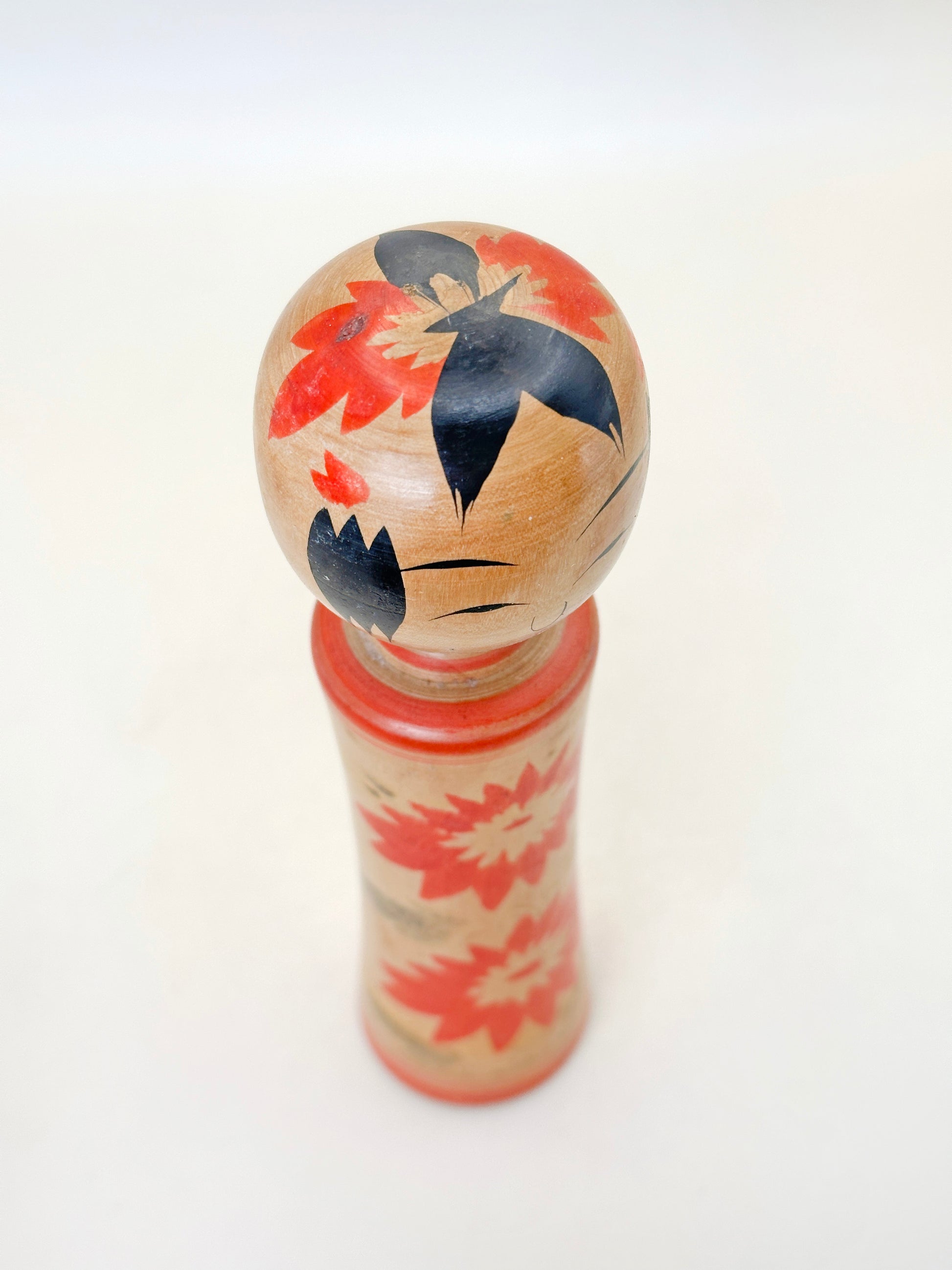 This Naruko kokeshi by Morio Takahashi 高橋盛雄 (1917–2000) is a vibrant example of the Takakan lineage, reflecting both strong tradition and the postwar revival spirit of Naruko.