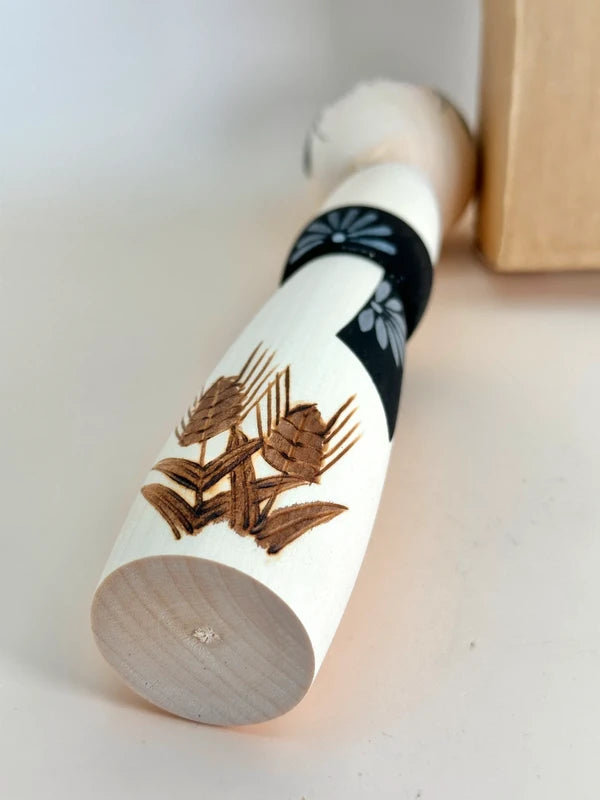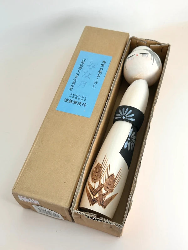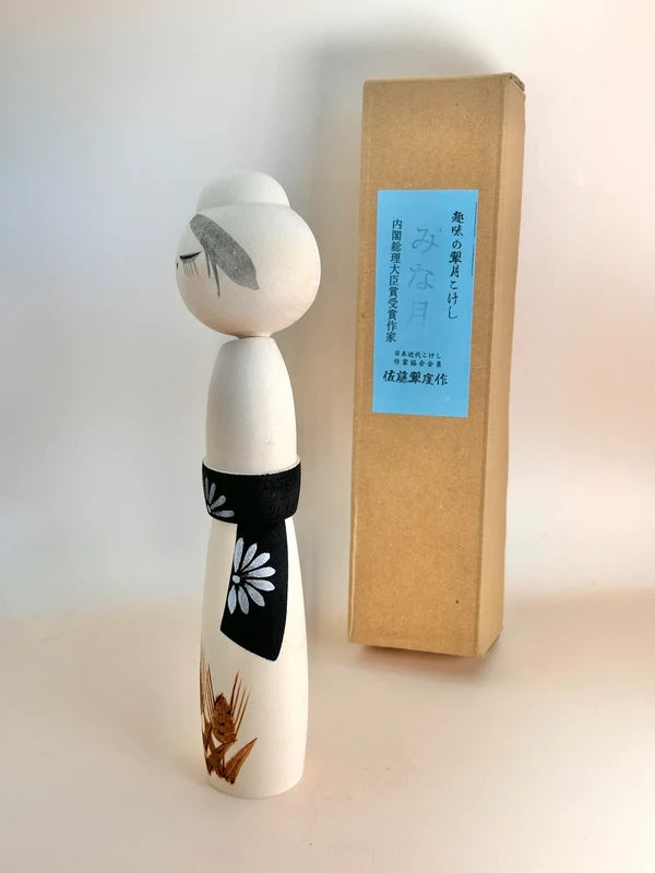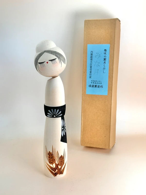 A perfect condition sōsaku kokeshi doll by acclaimed artist Sato Suigai (佐藤翠涯) stands at 22cm and radiates seasonal serenity and minimalism. Crafted in Suigai’s signature modernist style, the doll presents a graceful figure with a delicate wheat motif hand-painted at the hem of her garment—symbolizing the rich harvest of late autumn. Her simple white form is contrasted by a bold black obi (belt) adorned with a single white flower, emphasizing the refined balance of natural themes and graphic composition.