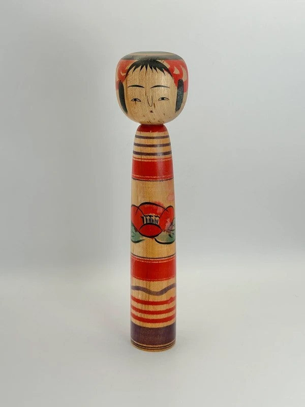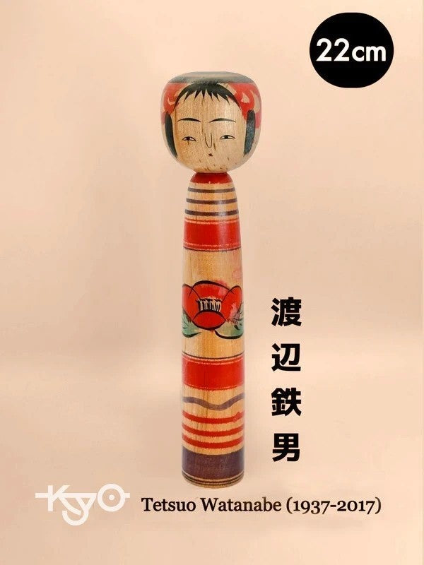 Born on February 1, 1937, in Tsuchiyu, Fukushima Prefecture, he was the second son of a farming family. His deep connection to his hometown's rich kokeshi heritage profoundly influenced his work. Watanabe's kokeshi dolls are celebrated for their adherence to the classic Tsuchiyu aesthetic, characterized by a slightly larger head and a tapered body adorned with hand-painted designs. The doll’s serene facial expression and delicate brushwork exemplify the artistry of Tsuchiyu kokeshi. A bold red chrysanthemum adorns the body, symbolizing longevity and rejuvenation. Tsuchiyu kokeshi have a slightly wider head and a rounded, tapering body, often decorated with stripes and vibrant colors like red, black, and purple. Each piece reflects his commitment to traditional craftsmanship and his personal artistic vision.