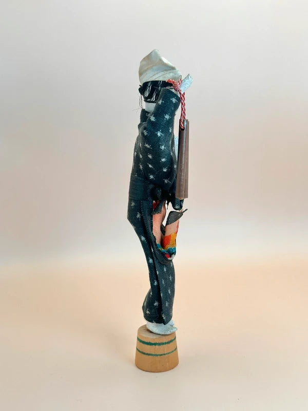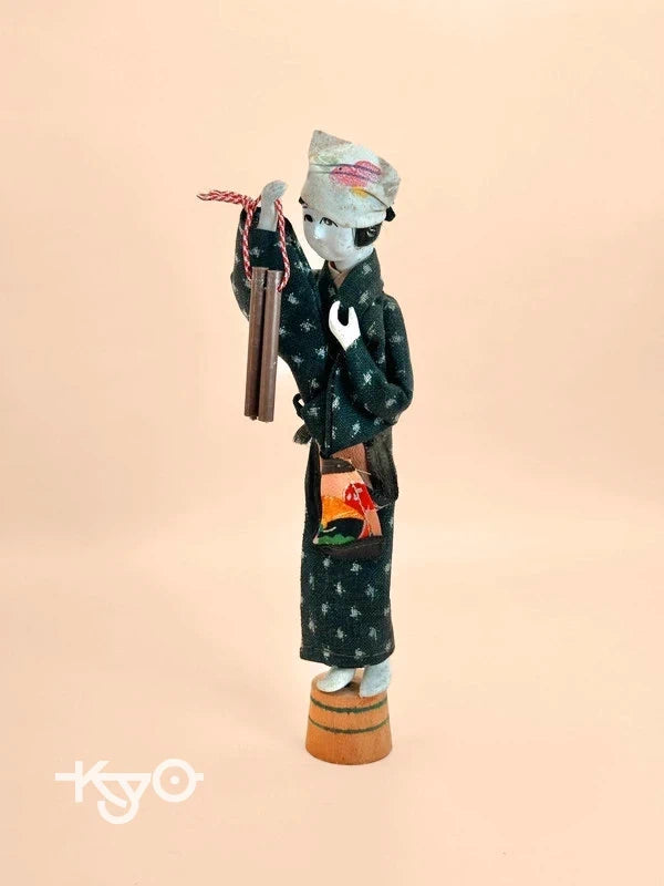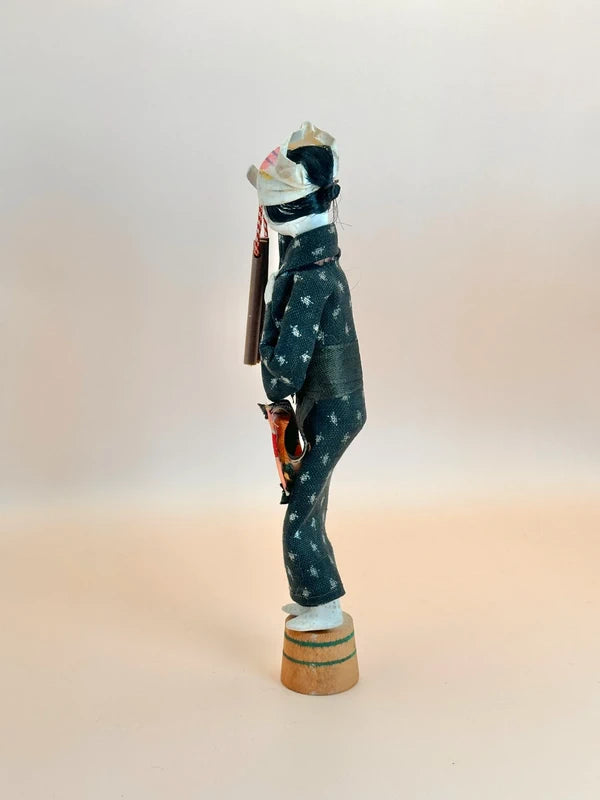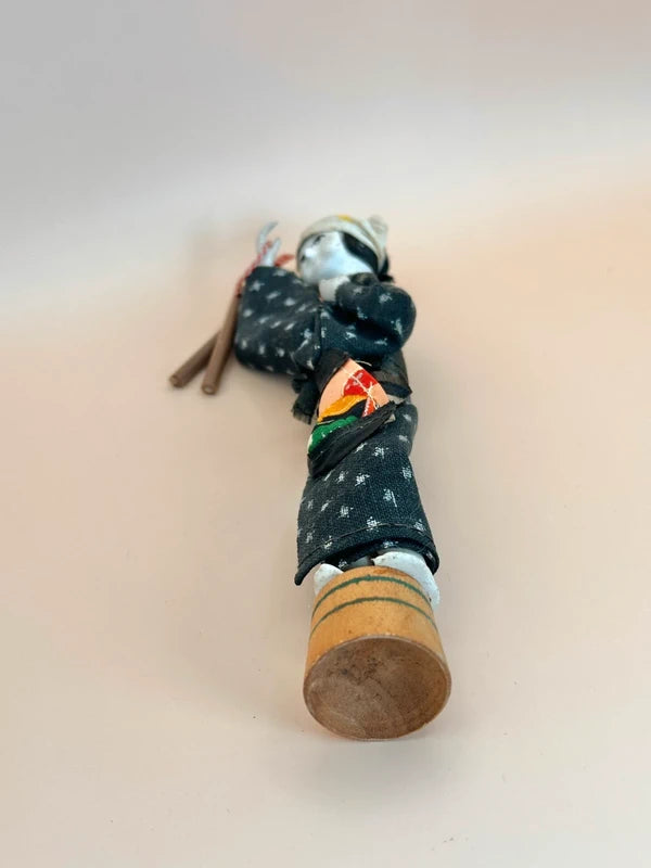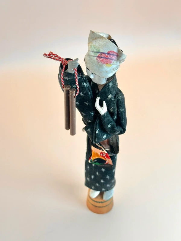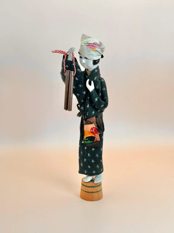 The doll holds a pair of hyōshigi—wooden clappers traditionally used in Japanese festivals or street performances, particularly by fire watchmen or performers. The hyōshigi are tied with a red-and-white cord, a color pairing symbolizing celebration and good fortune. Size: