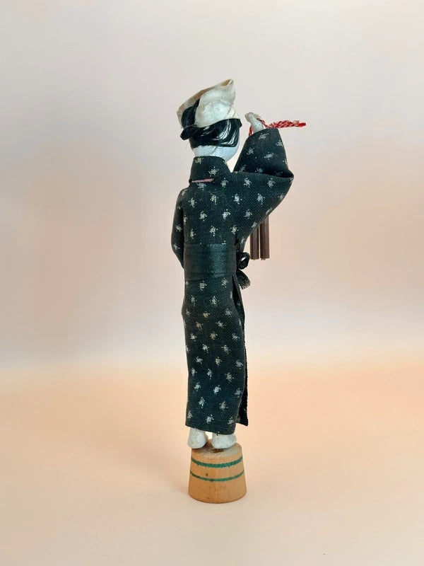 Vintage omiyage Japanese folk art figure, traditionally gifted as a keepsake. The doll represents a traditionally dressed Japanese woman, it stands on a miniature wooden onsen (hot spring) basket, a detail that hints at leisure or travel, common themes in Japanese gift-giving culture.
