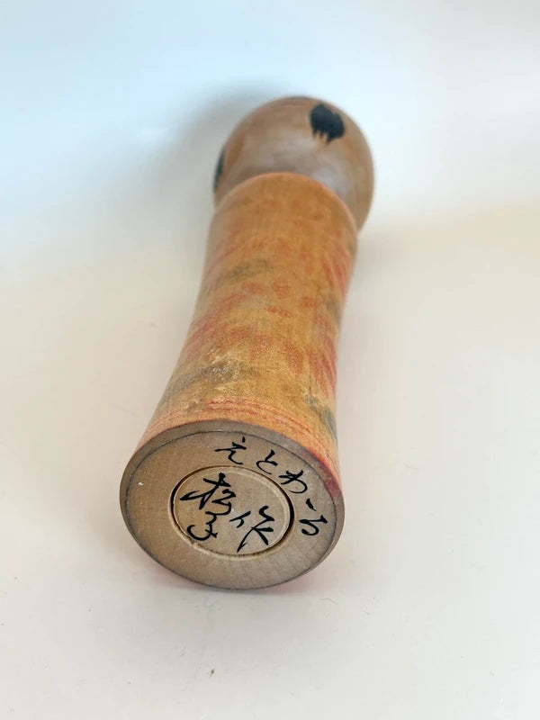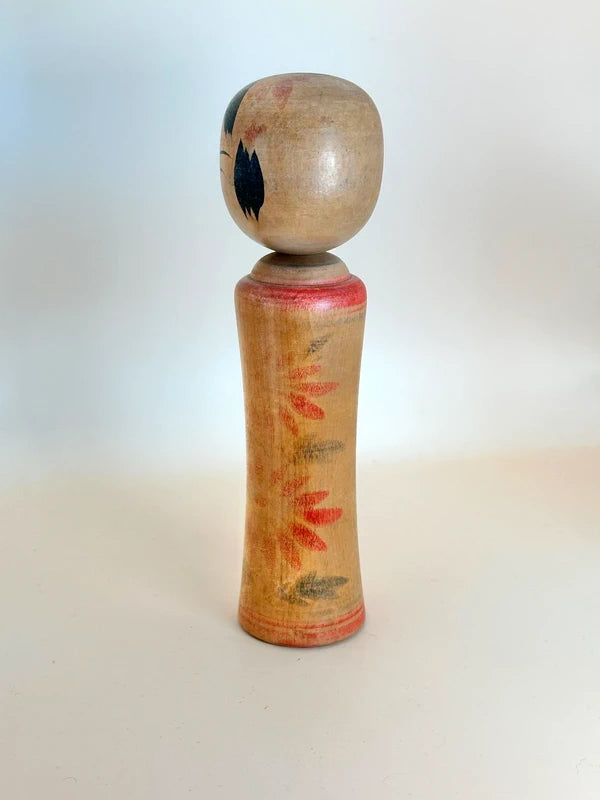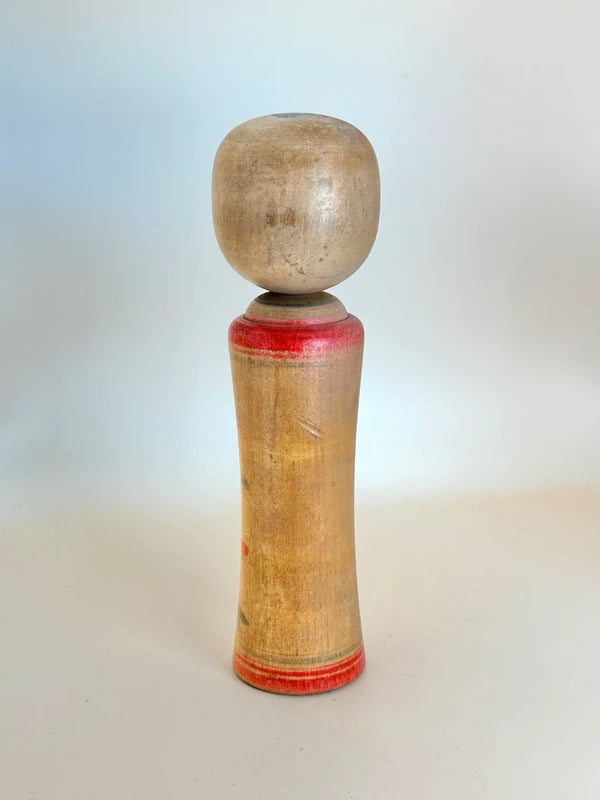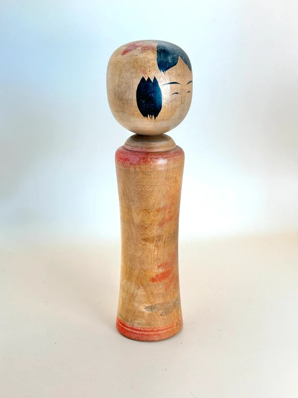A Naruko kokeshi by Matsuko Takahashi captures the soft charm and restraint typical of the Naruko tradition. The doll is gracefully turned with a subtle flare at the base, and painted in faded reds and earth tones that softly blend into the woodgrain, a result of time and aging that adds to its nostalgic beauty. The expression is warm and understated, with gently arched brows and a delicate smile. Her signature style features minimal but expressive facial details, capturing a sense of quiet dignity.