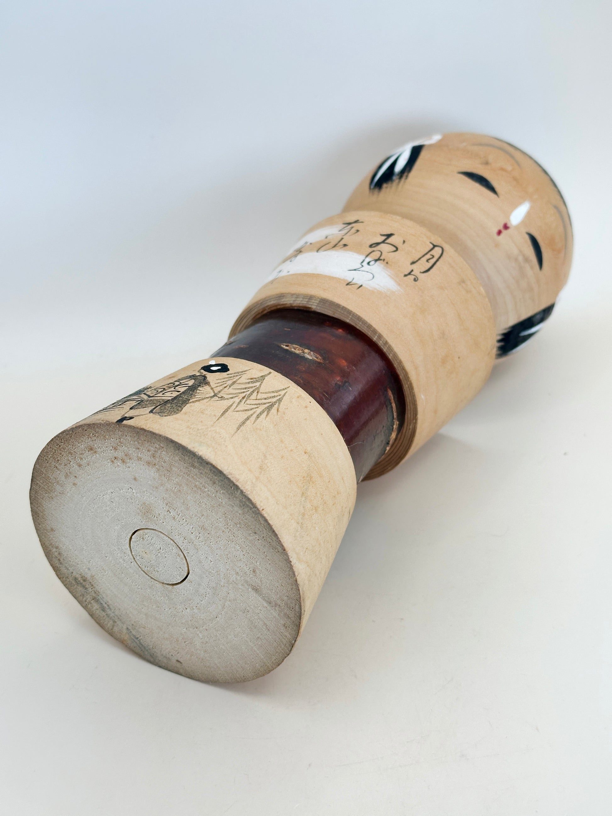 This omiyage kokeshi doll from Kyoto captures the elegance and nostalgia of Japan’s old capital, blending traditional craft with poetic charm. The doll is painted with a serene female face and her cylindrical body is inscribed with the lyrics of “Gion Kouta” (祇園小唄), a famous song associated with the historic Gion district, known for its geisha culture and atmospheric streets.
