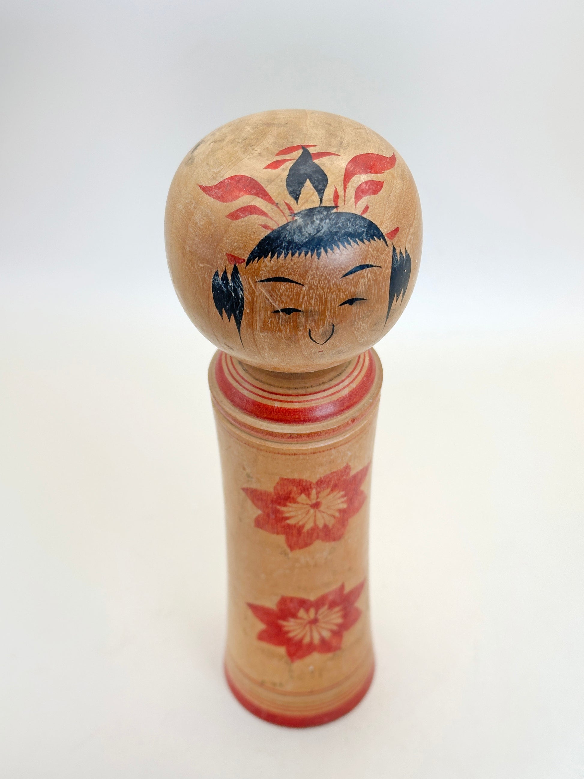 A vintage Naruko kokeshi by Igarashi Isamu (五十嵐勇, 1935–2011) features a rounded head with a serene, smiling face—its eyebrows and eyes arch delicately, and the hair is painted in black with red flower petal accents, conveying both warmth and elegance. The body has a gentle flare, with traditional Naruko-style red ringed borders at the top and base. The surface is adorned with bold floral motifs.