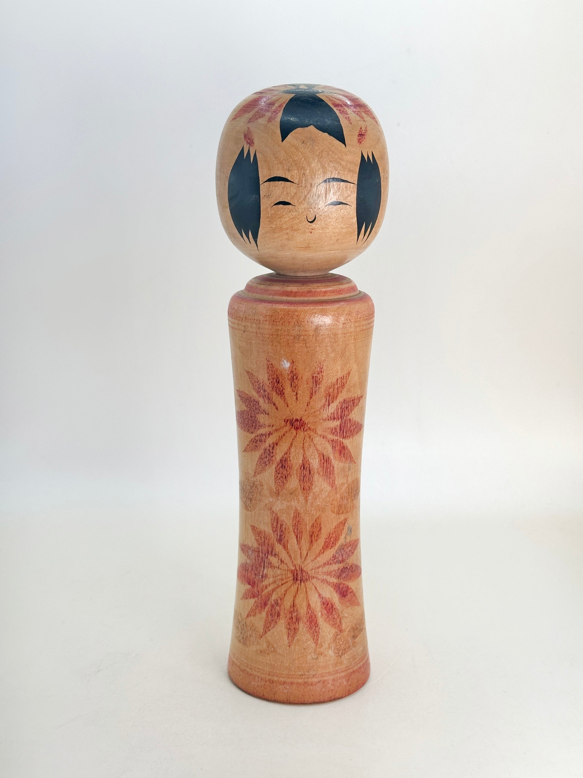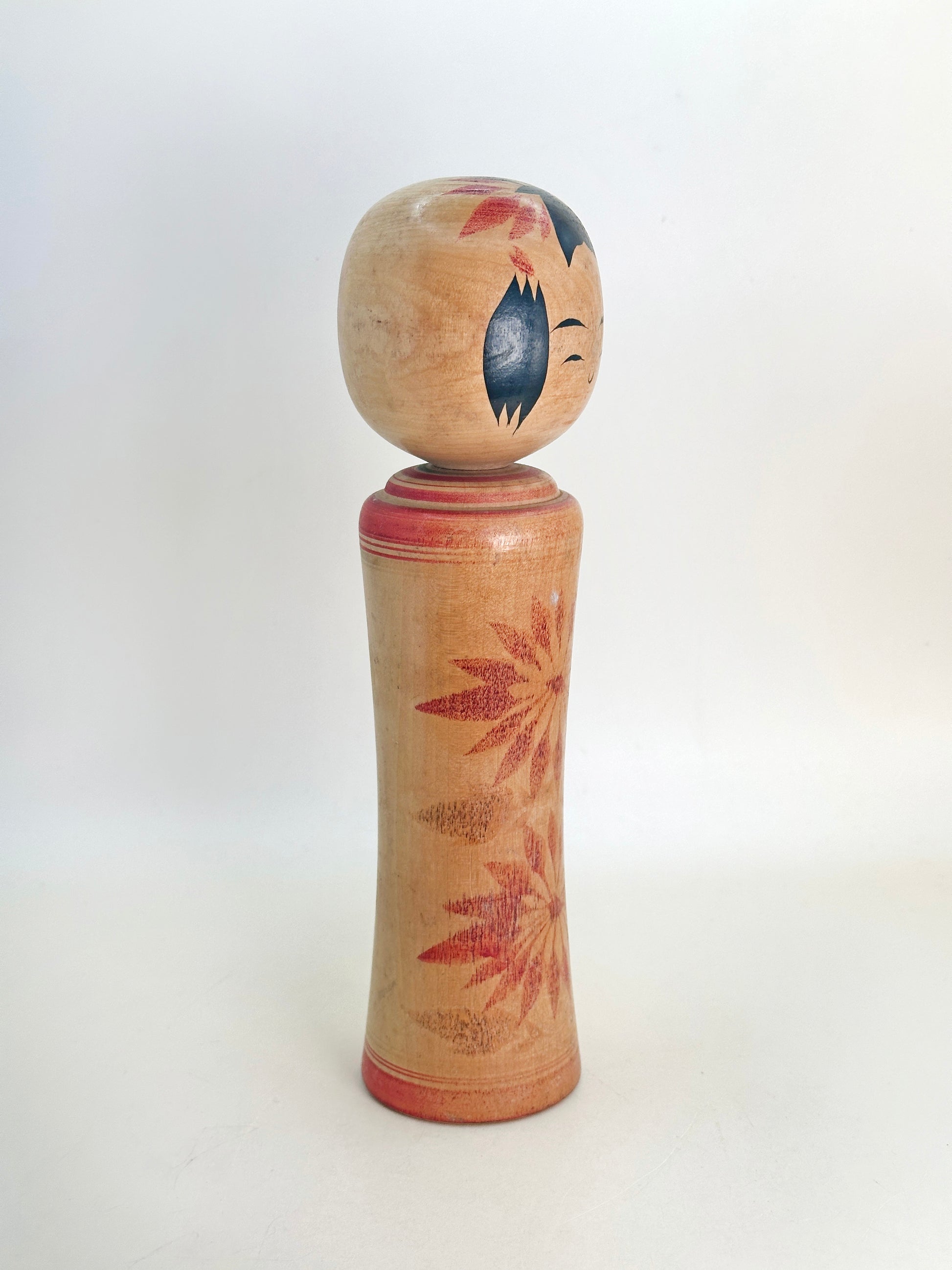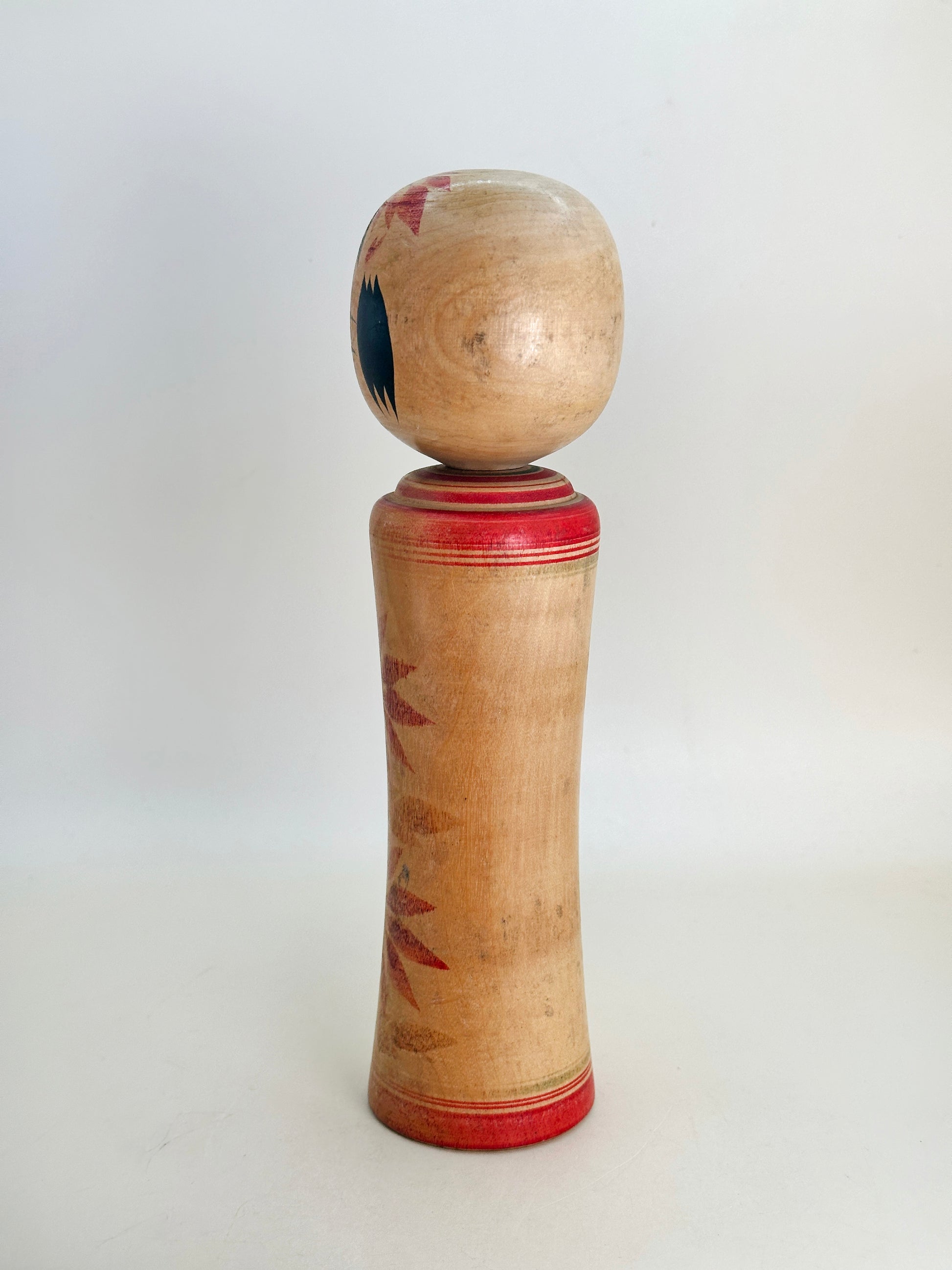A Naruko kokeshi by Matsuko Takahashi captures the soft charm and restraint typical of the Naruko tradition. The doll is gracefully turned with a subtle flare at the base, and painted in reds. The expression is warm and understated, with gently arched brows and a delicate smile. Her signature style features minimal but expressive facial details, capturing a sense of quiet dignity.