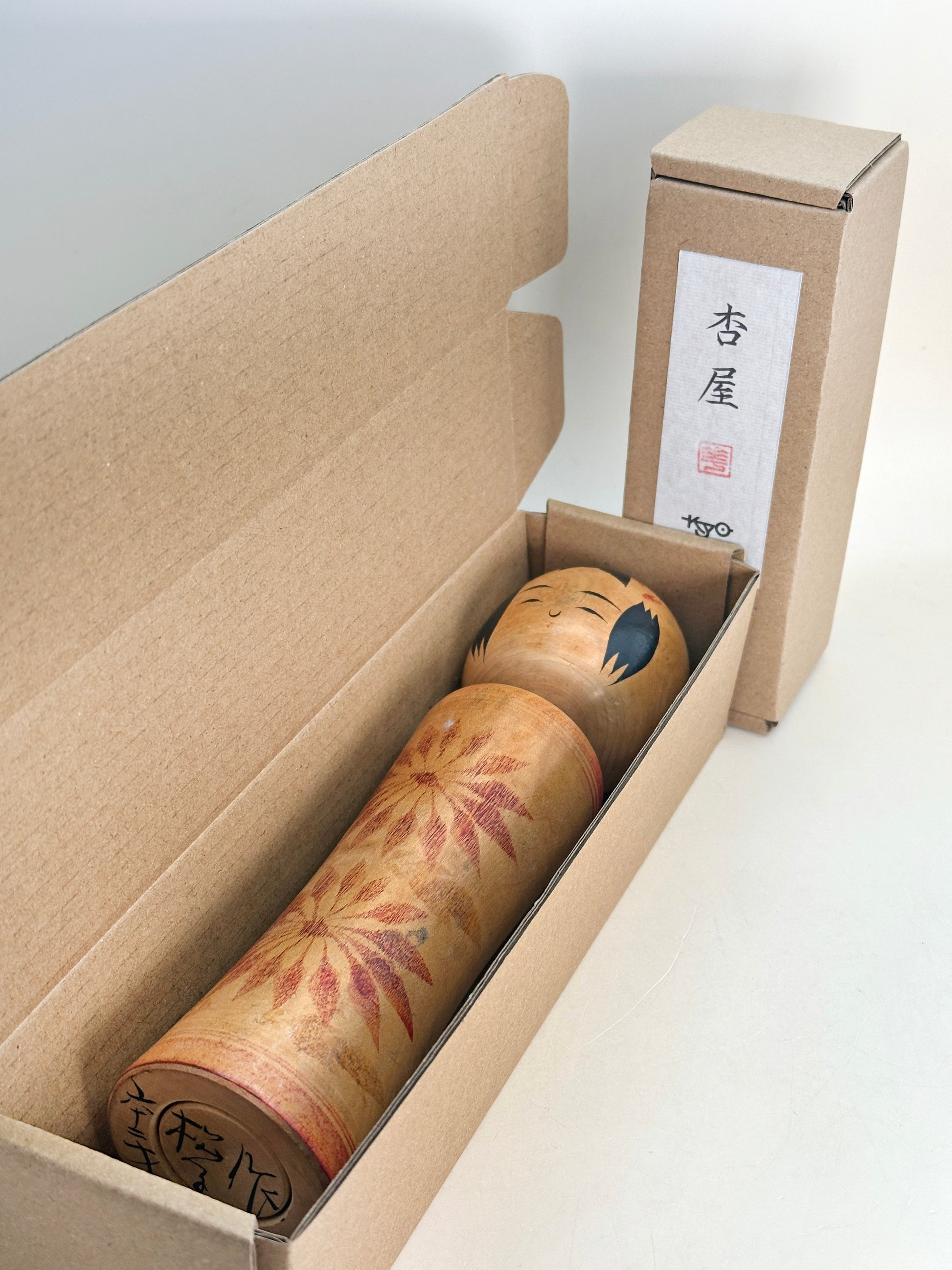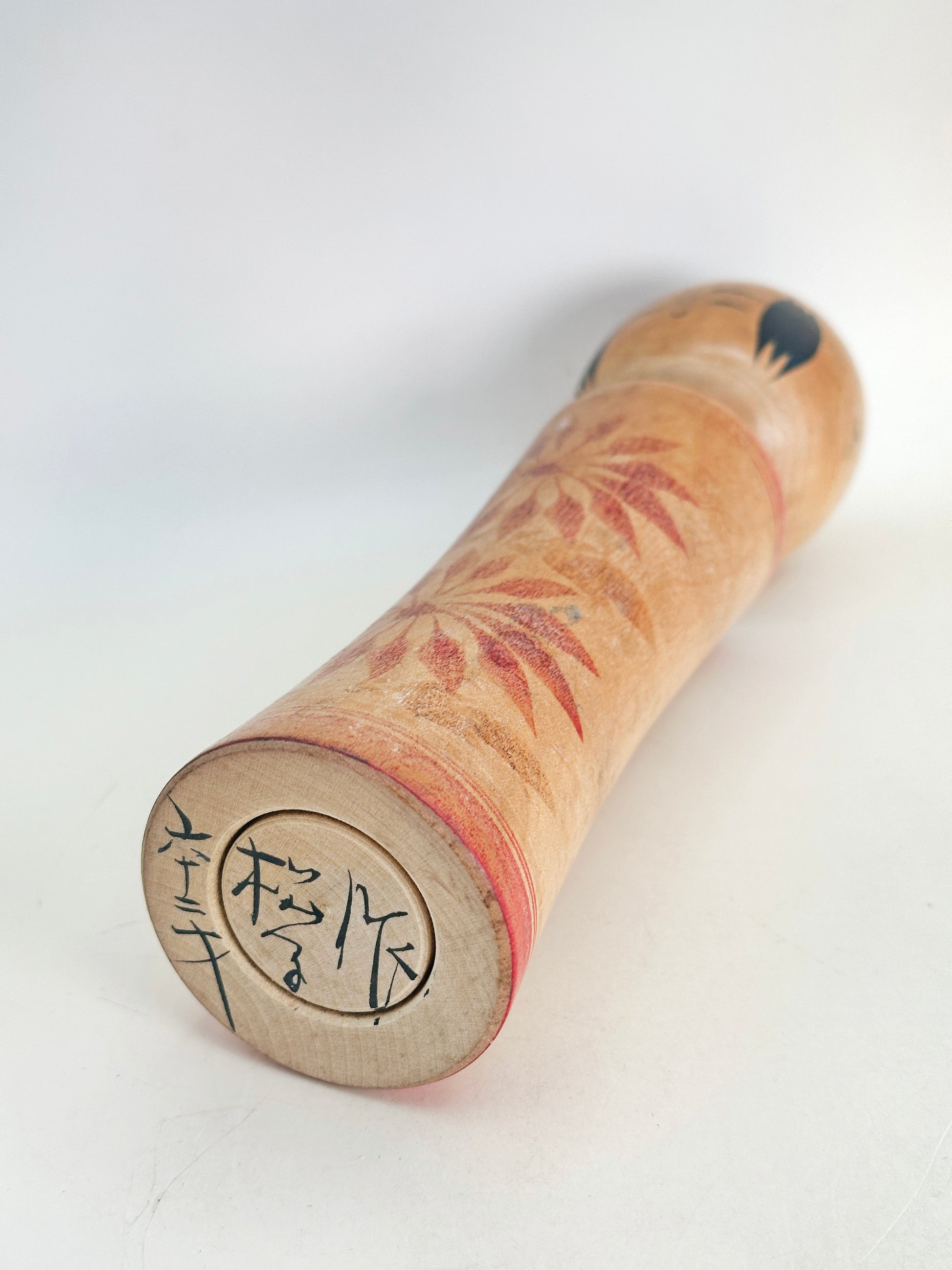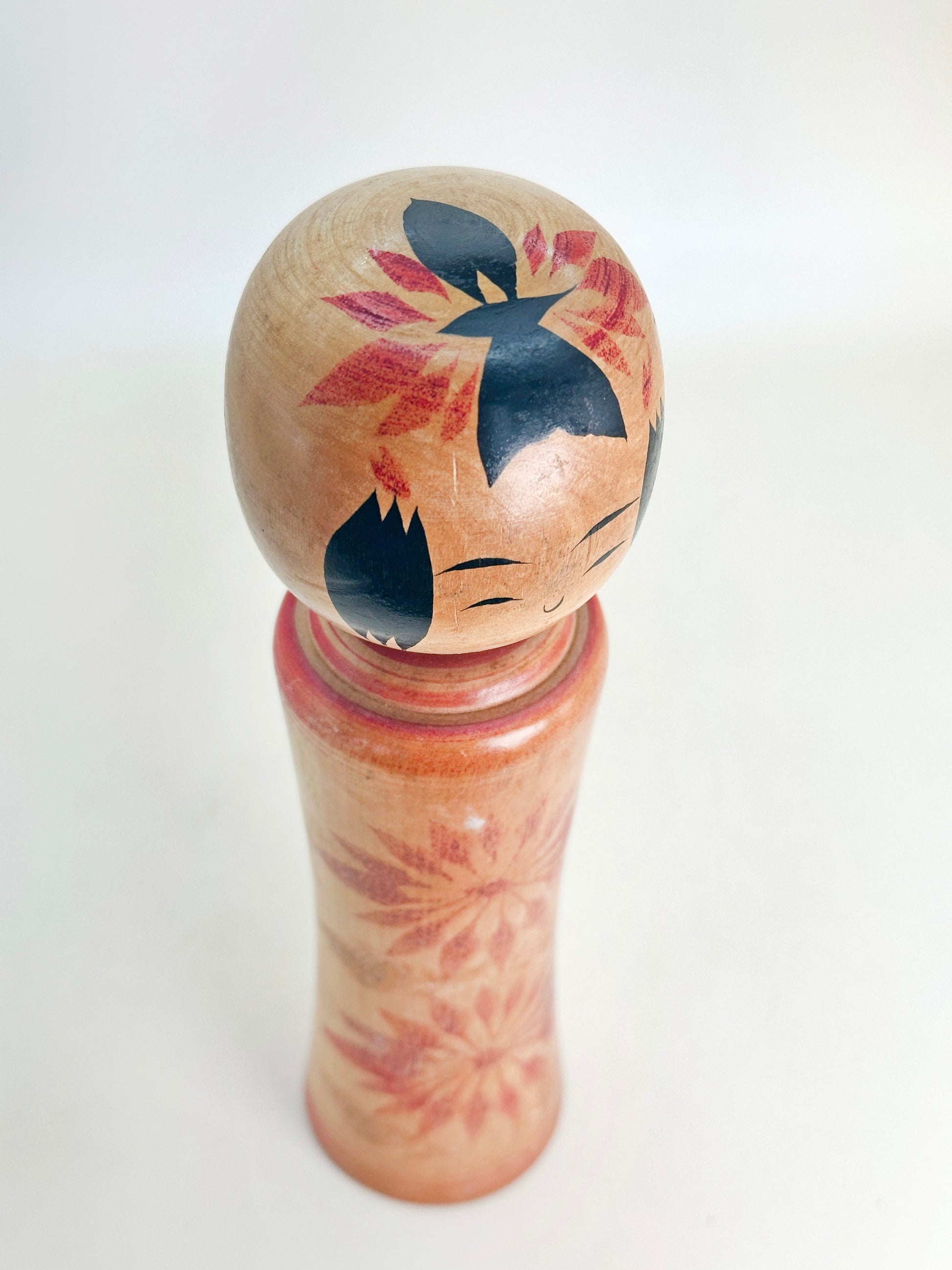 A Naruko kokeshi by Matsuko Takahashi captures the soft charm and restraint typical of the Naruko tradition. The doll is gracefully turned with a subtle flare at the base, and painted in reds. The expression is warm and understated, with gently arched brows and a delicate smile. Her signature style features minimal but expressive facial details, capturing a sense of quiet dignity.