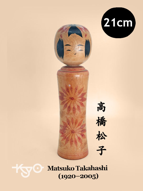 Matsuko Takahashi (1920–2005) was born in Naruko, Miyagi Prefecture, into a family deeply rooted in the kokeshi tradition. After working during the war years and raising her children, she returned to Naruko in 1950 and began crafting kokeshi around 1952. Initially focused on souvenir dolls, her interest shifted to traditional forms. By 1956, she was painting and decorating traditional Naruko kokeshi on lathed wood provided by local artisans.