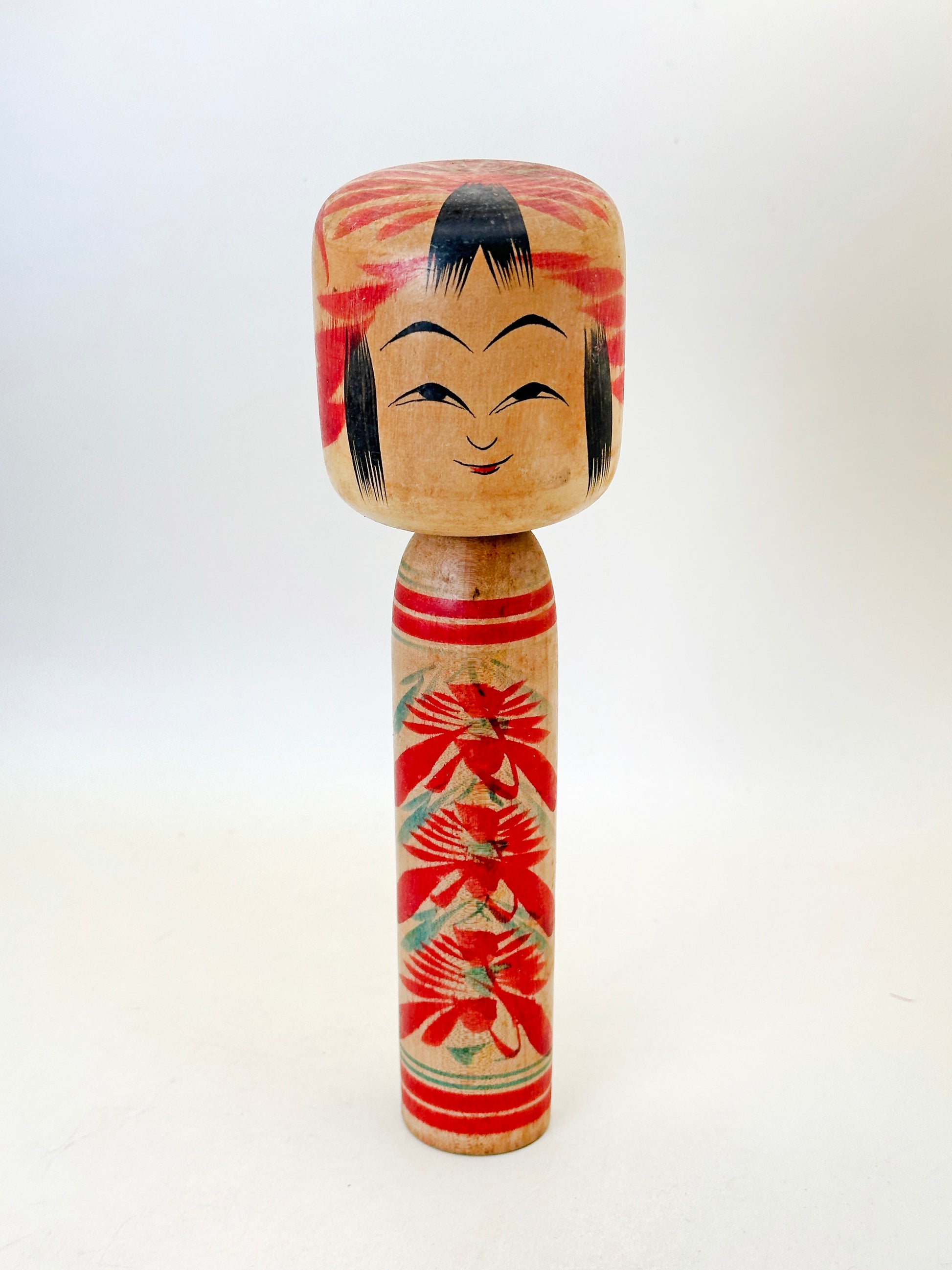 This Togatta kokeshi by Fumio Sato (佐藤文男, 1923–1986) is a radiant expression of the Togatta lineage, rendered with a gentle elegance and refined brushwork. The doll features a cheerful, rounded face framed by deep black side bangs and bright red hair ornaments, giving her an expressive and welcoming presence. Her body is adorned with brilliant red and green chrysanthemum-like floral motifs in vertical arrangement—a hallmark of the Togatta tradition—executed with precision and liveliness. The delicate color gradient and layering of brushstrokes suggest the practiced hand of a craftsman deeply immersed in his art.
