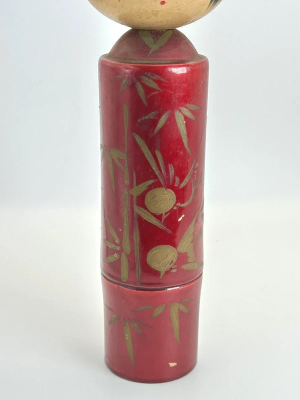 The cylindrical body is painted in a deep, vivid red lacquer and adorned with elegant gold bamboo and plum blossom motifs, symbolizing resilience, longevity, and renewal—core values in Japanese aesthetics and seasonal beauty. The large rounded head features a serene, minimalist expression with fine black lines for eyes, delicate lips, and symmetrical eyebrows. The striking black and red “crown-like” hair design gives the face a sense of formality and refinement.