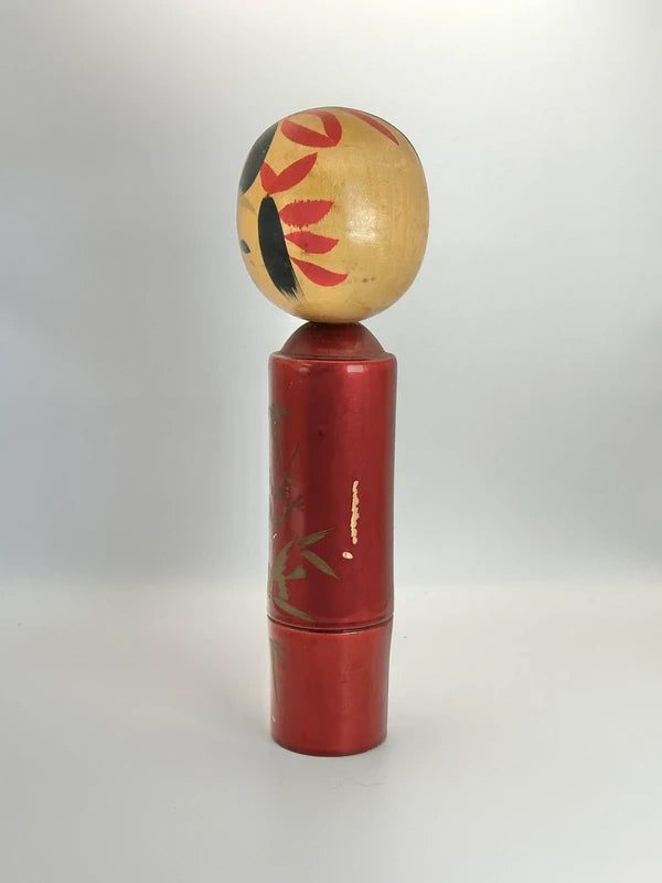 A vintage soaku kokeshi doll of renowned artisan Takahashi Tatsuro 高橋達郎, a respected name in the world of traditional Japanese kokeshi making. This piece embodies the elegance and bold design typical of the Yamagata-style (Yamagata-kei) within the traditional kokeshi (伝統こけし) lineage.