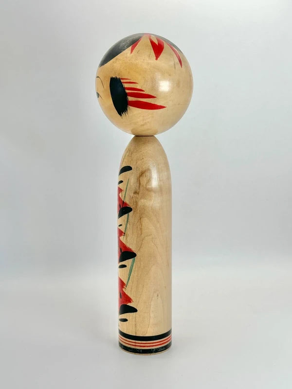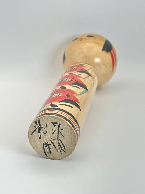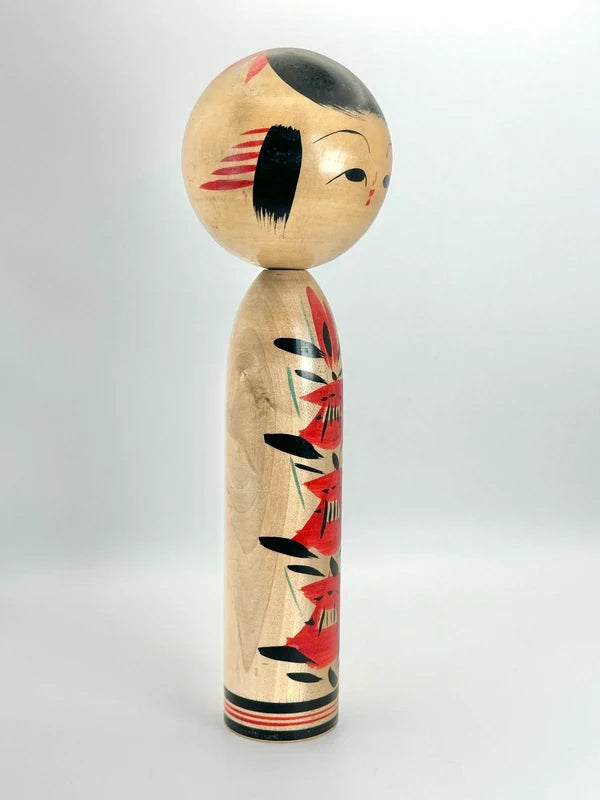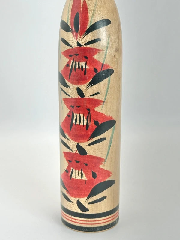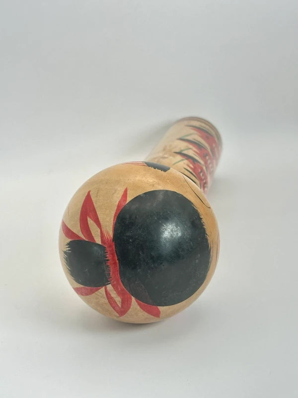She is one of the few prominent female artists in the kokeshi-making world and worked within the Yajirō-kei (弥次郎系) tradition, a style known for its expressive floral patterns, vivid colors, and stylized forms. Nidaime Tetsuen was particularly recognized for her delicate, elegant painting style and her ability to maintain the traditional aesthetics while adding a personal touch. Her works often featured clean, balanced floral designs and serene facial expressions, which helped distinguish her creations.