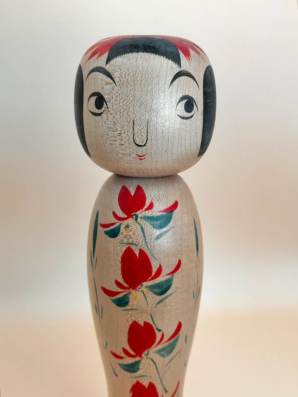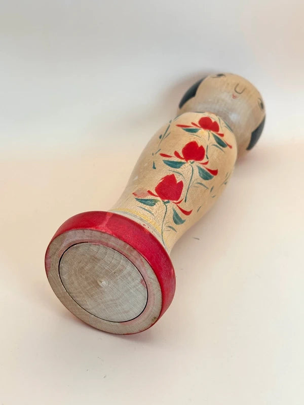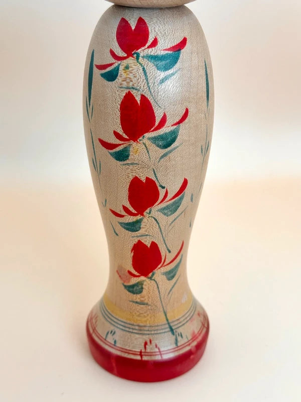 The body is softly curved and delicately painted with a cascading vertical arrangement of red and green stylized flowers, climbing upward in rhythmic balance. The artwork is both graceful and playful, reflecting the rustic yet refined charm typical of the Zao strain of kokeshi. The doll stands on a wide base with subtle lathe-turned lines, lending her form a grounded elegance.