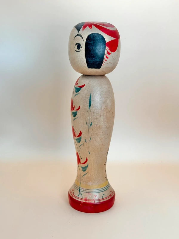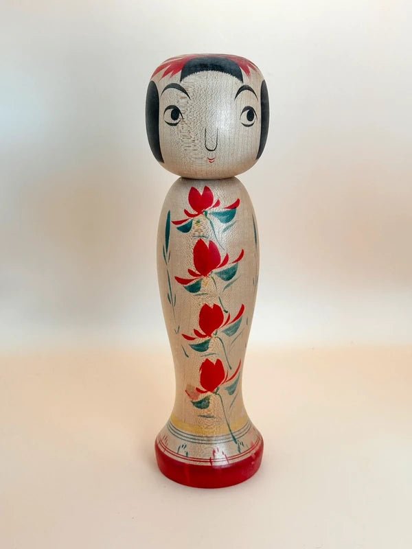 This elegant Zao-style kokeshi by Shinya Abe is a beautiful example of the soft, flowing aesthetic that characterizes the Atsumi lineage. Standing 24cm tall, this doll features a rounded head with large, expressive eyes and finely detailed hair painted in bold black with red accents. Her gentle, almost whimsical smile gives her a warm, welcoming presence.