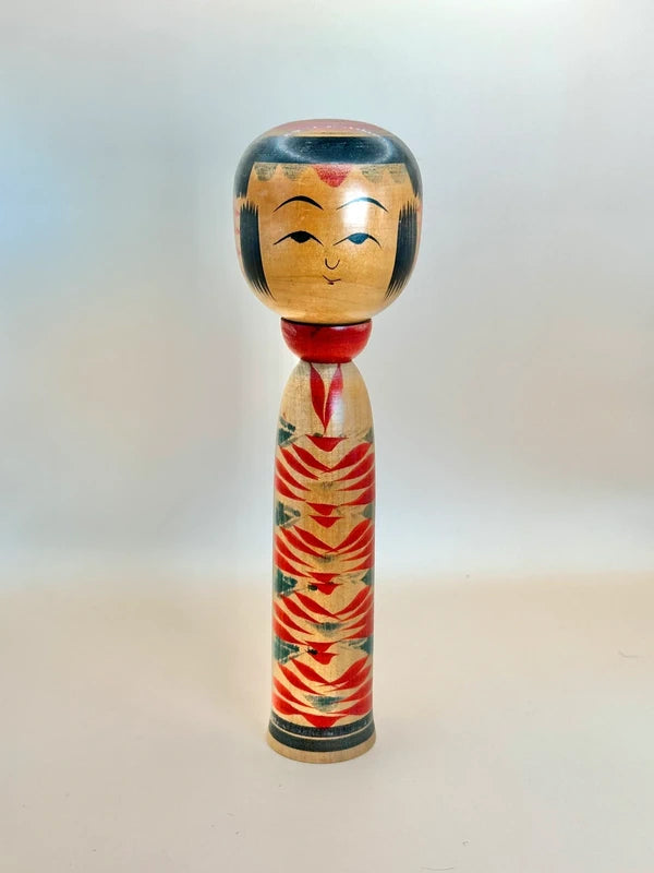 A Yajirō-style kokeshi by Bunichi Kamata exudes a warm, rustic character that reflects the heart of traditional Miyagi craftsmanship. The doll’s full, rounded head features a serene, smiling expression with distinctive side-parted bangs and sharply defined side hair, accented with soft red highlights on the cheeks and crown. Her lively, engaging eyes and slightly upturned mouth evoke a playful, youthful spirit.