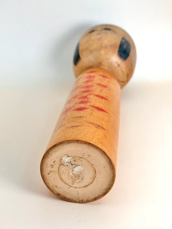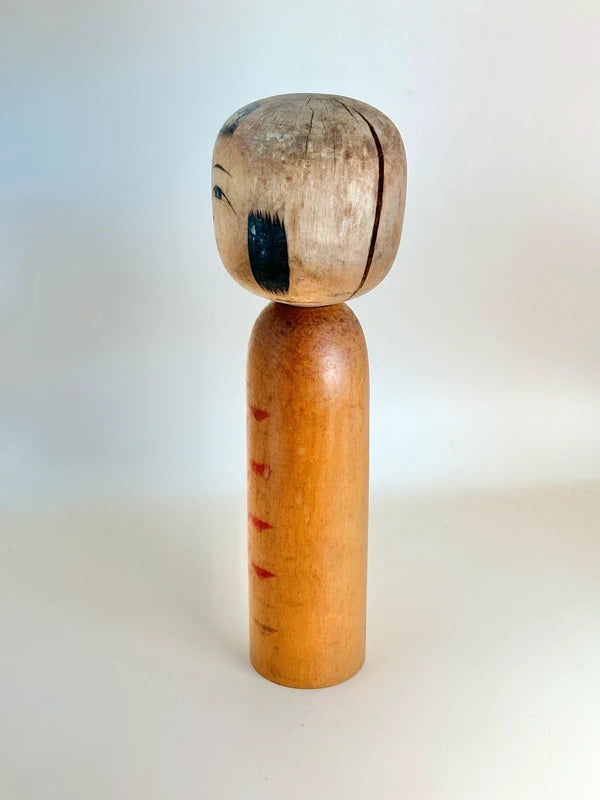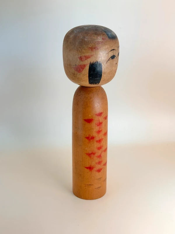 A very old Nanbu-style kokeshi by Eikichi Sato is a fine example of the traditional Northern Tōhoku folk craft, reflecting a quiet elegance and timeless simplicity. The doll features a rounded head with a soft, gentle expression, delicately hand-painted with expressive black hair and arched eyebrows. Its body is decorated with a series of symmetrical, stylized floral or feather-like motifs in red pigment, descending vertically in balanced rhythm, hallmarks of the Nanbu lineage.