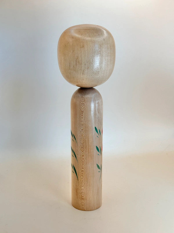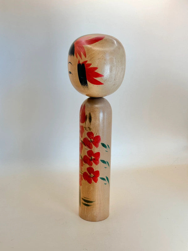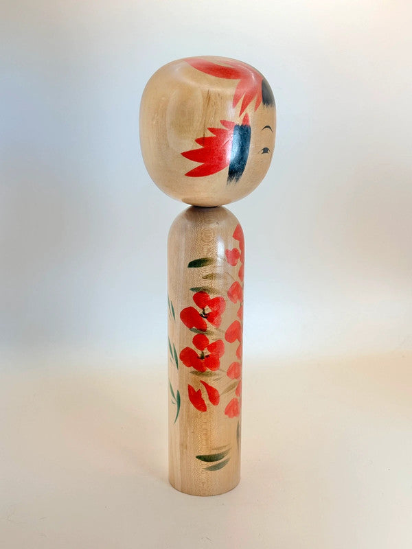 A Yamagata-style kokeshi by Eiichiro Takasaki is a refined example of regional craftsmanship, showcasing a cascading floral design in vivid red across the body—an elegant contrast to the soft natural wood finish. The doll’s expression is delicate and composed, with subtly drawn features and short bangs framed by traditional black side locks, typical of the Yamagata-kei style.