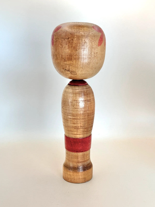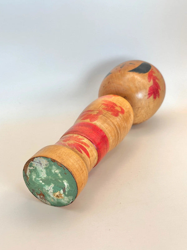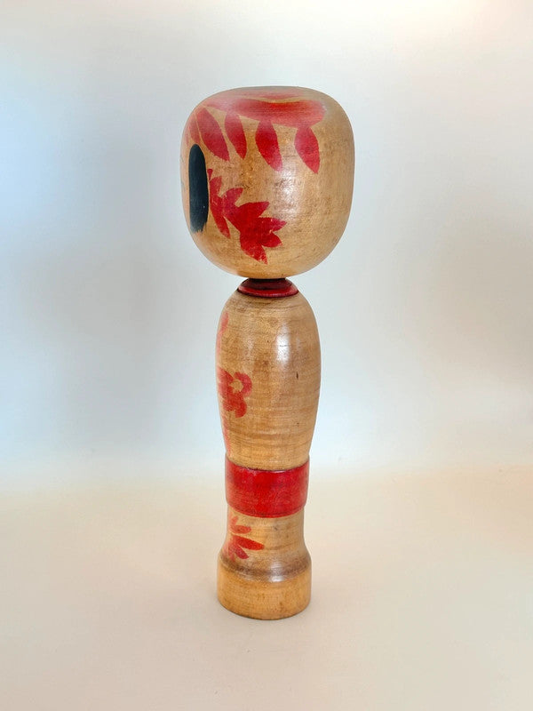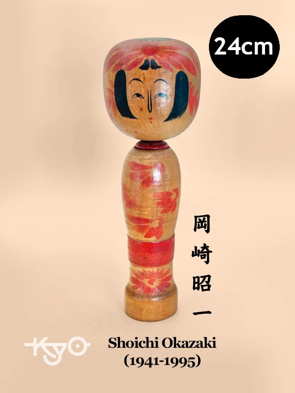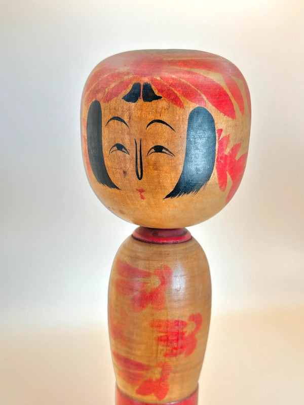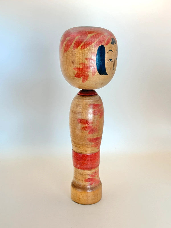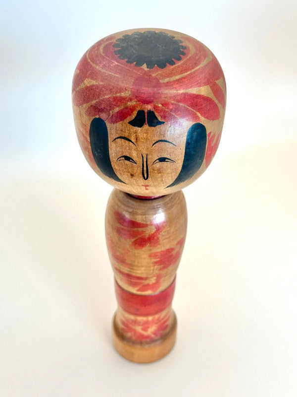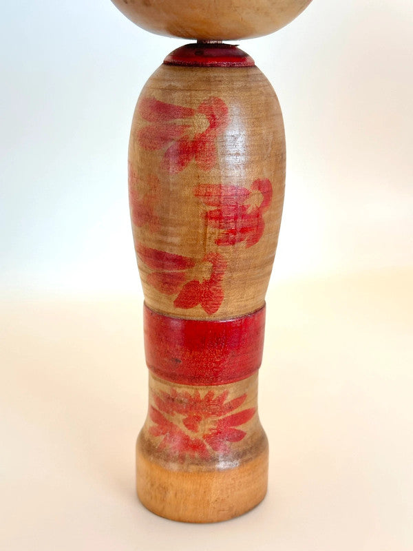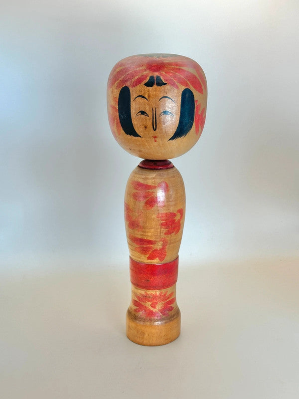 This Zao kokeshi by Shoichi Okazaki embodies the painterly charm and serene beauty of the traditional kokeshi of Yamagata Prefecture. With a gentle expression and stylized bangs framing the doll’s round face, it features bold red and black chrysanthemum patterns blooming across both the head and body, a common motif in Zao kokeshi, symbolizing seasonal beauty and grace.