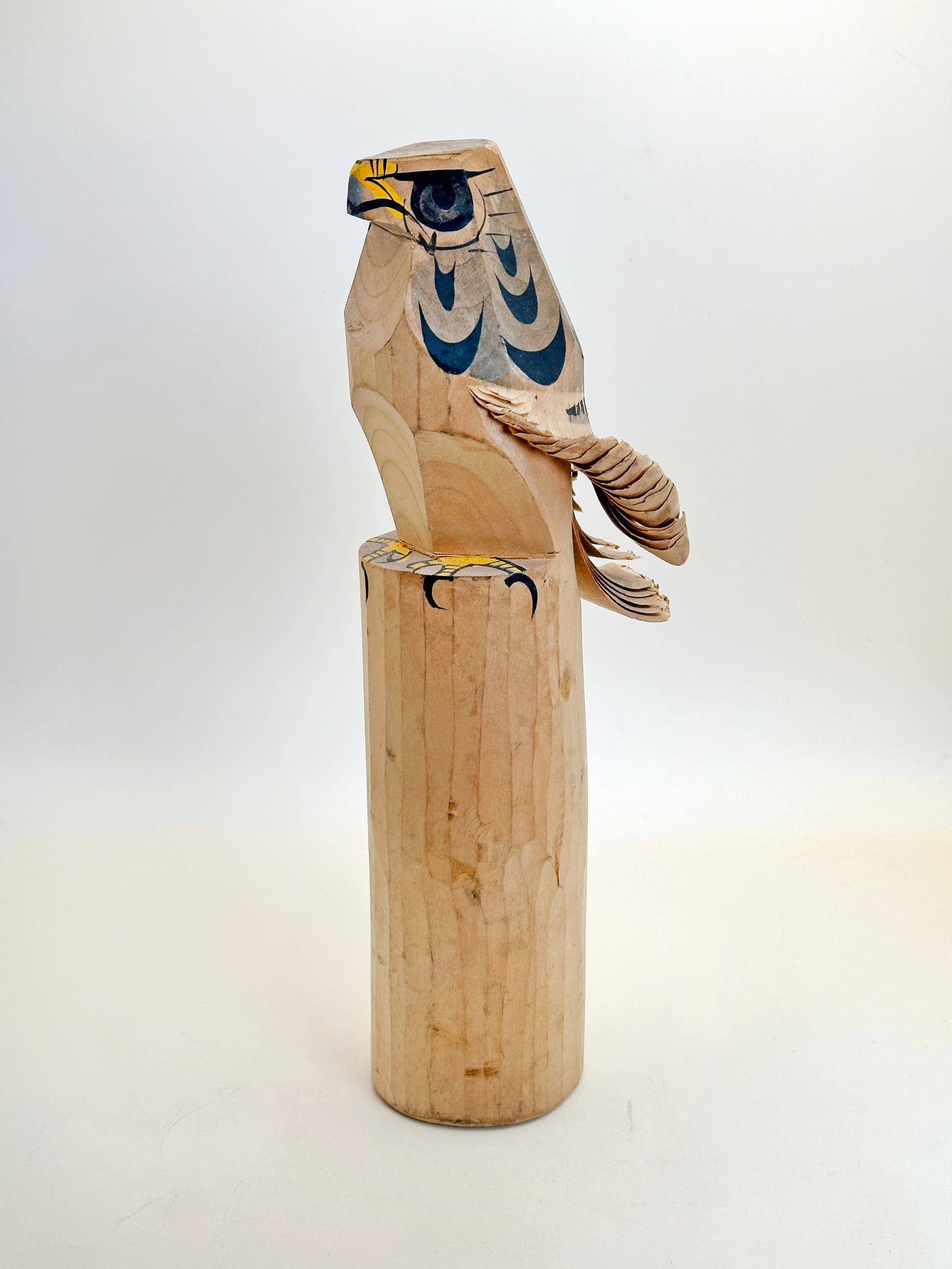 The subject of this piece is a hawk (鷹, taka) a powerful symbol of strength, courage, and good fortune in Japanese culture. The hawk is carved from a single block of wood and painted with striking black and yellow patterns. The most impressive detail lies in the exquisitely layered wings and tail, made by slicing thin, curled layers into the wood to mimic feathers, showcasing the carver’s refined skill and the unique aesthetic of this craft tradition.