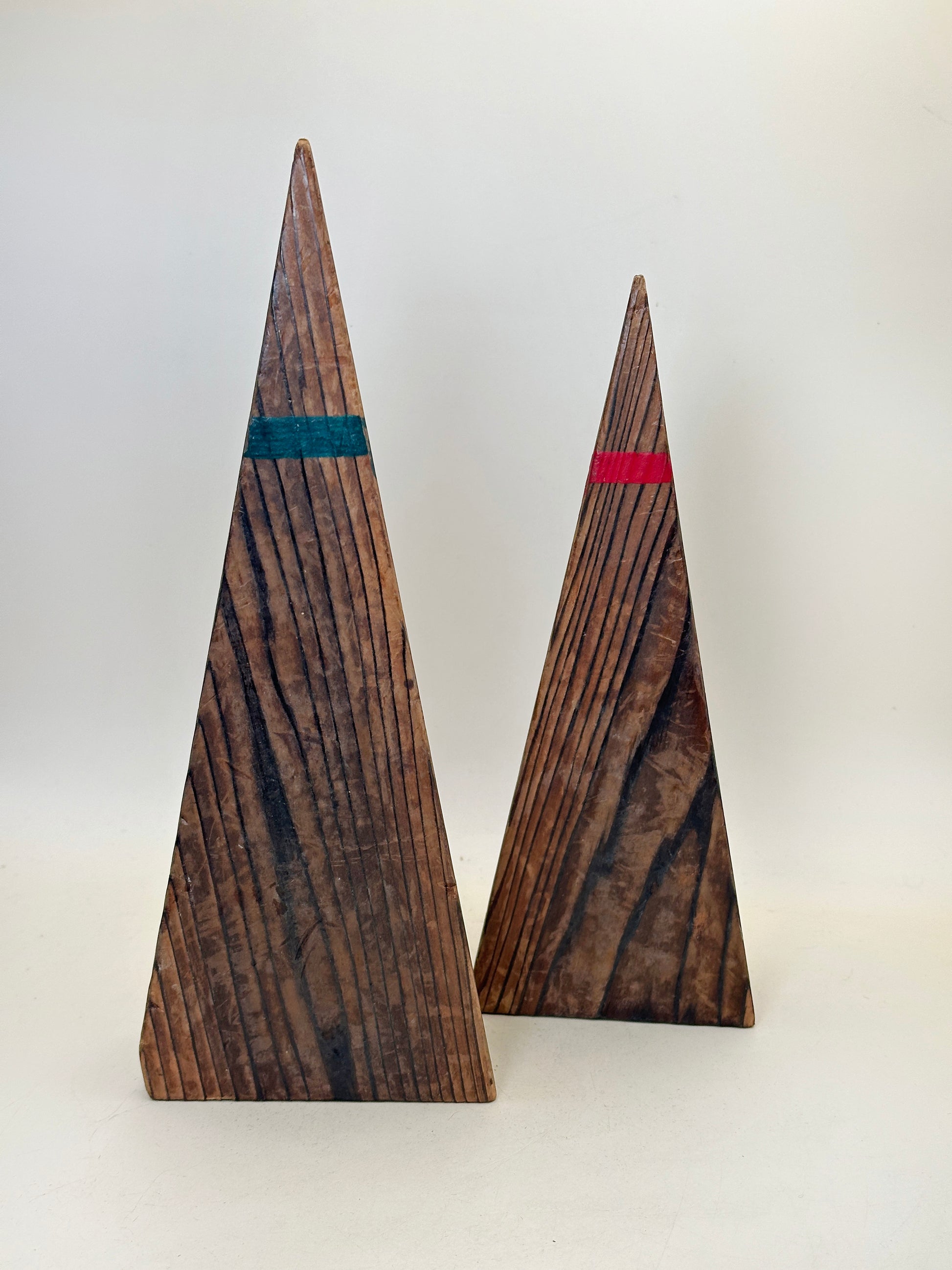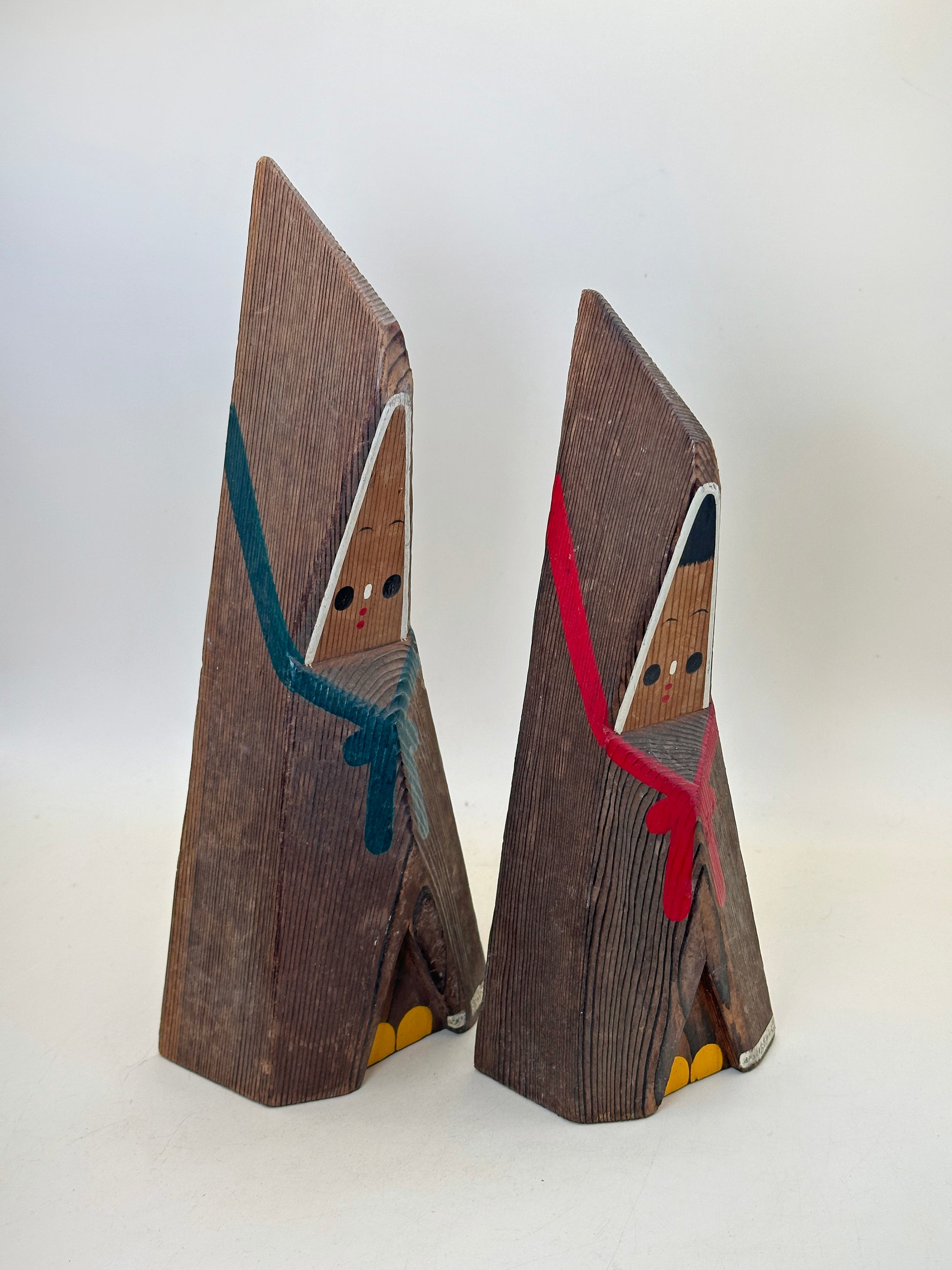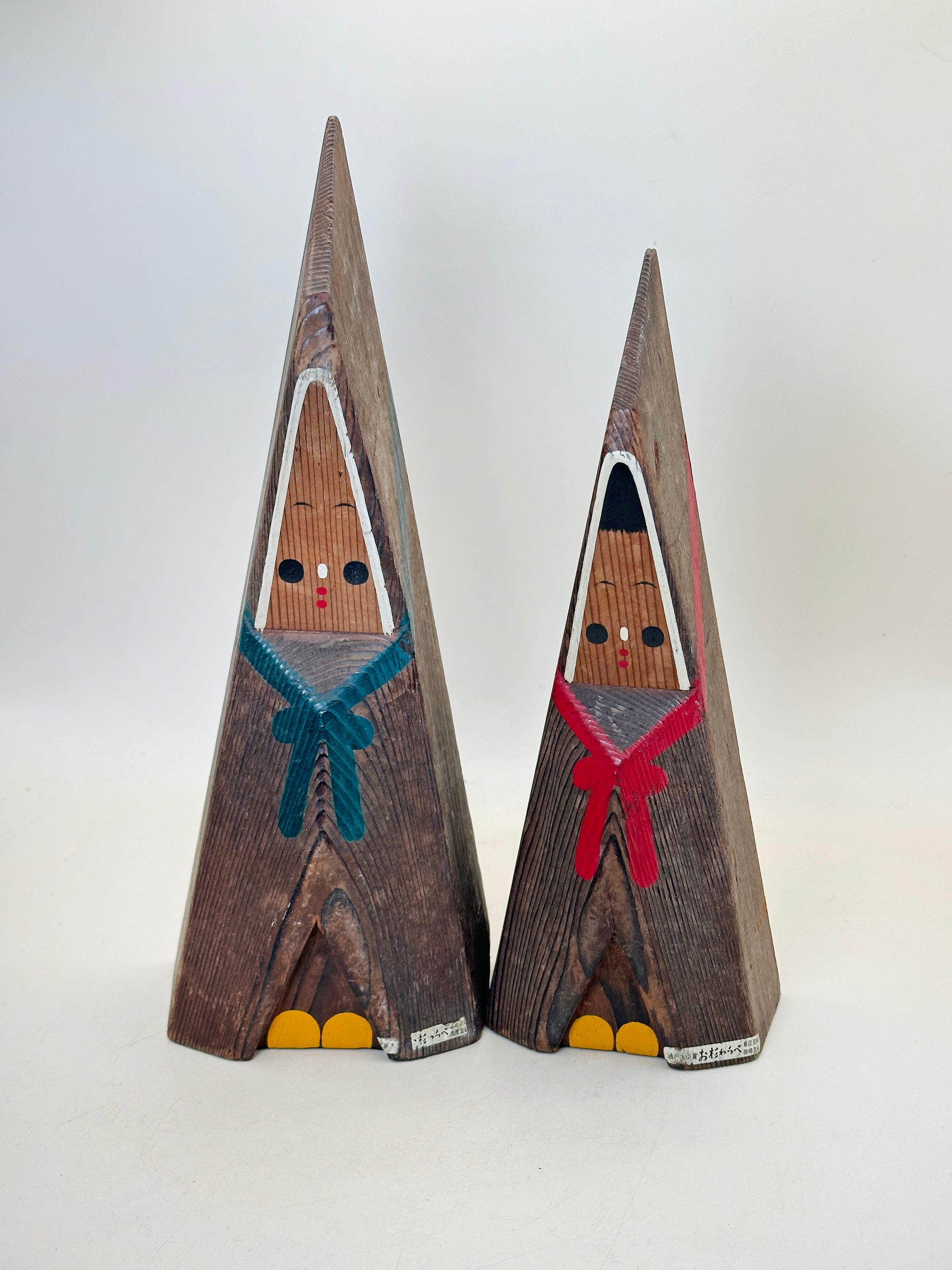 Carved from solid wood, each doll features a distinctive triangular silhouette, with the natural grain of the wood carefully preserved and enhanced. Their simple, stylized faces—round eyes, tiny red lips, and soft expressions—capture an innocent, almost nostalgic charm. Subtle hand-painted details, including the contrasting green and red garments, add a gentle touch of color while maintaining a rustic aesthetic.