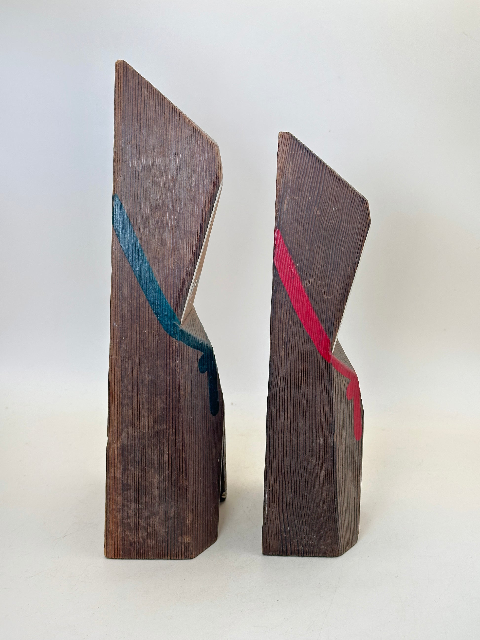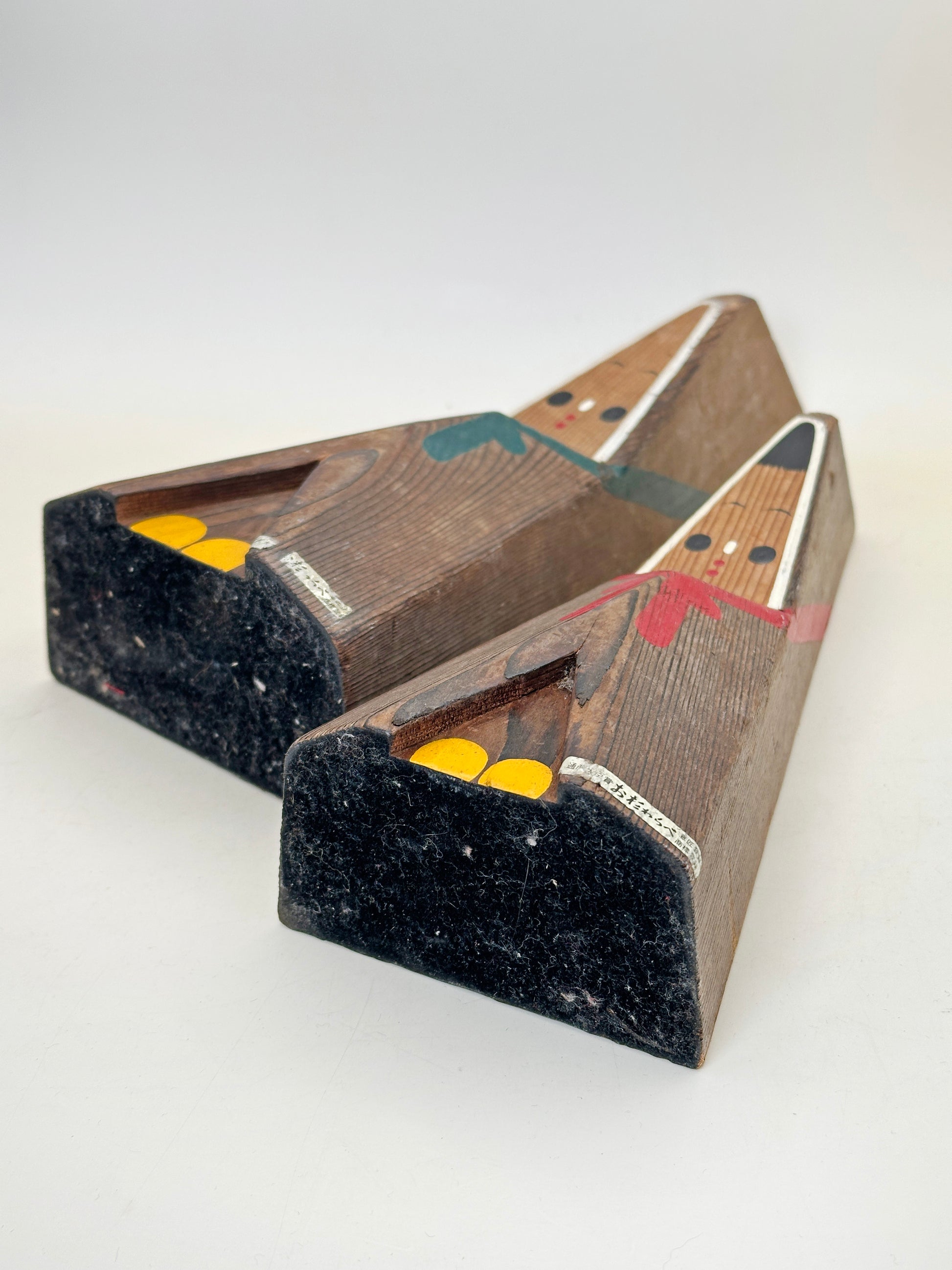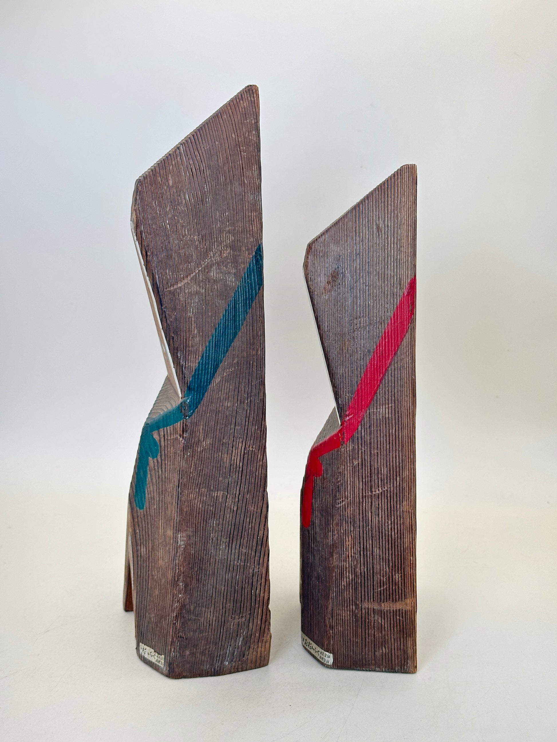 Carved from solid wood, each doll features a distinctive triangular silhouette, with the natural grain of the wood carefully preserved and enhanced. Their simple, stylized faces—round eyes, tiny red lips, and soft expressions—capture an innocent, almost nostalgic charm. Subtle hand-painted details, including the contrasting green and red garments, add a gentle touch of color while maintaining a rustic aesthetic.