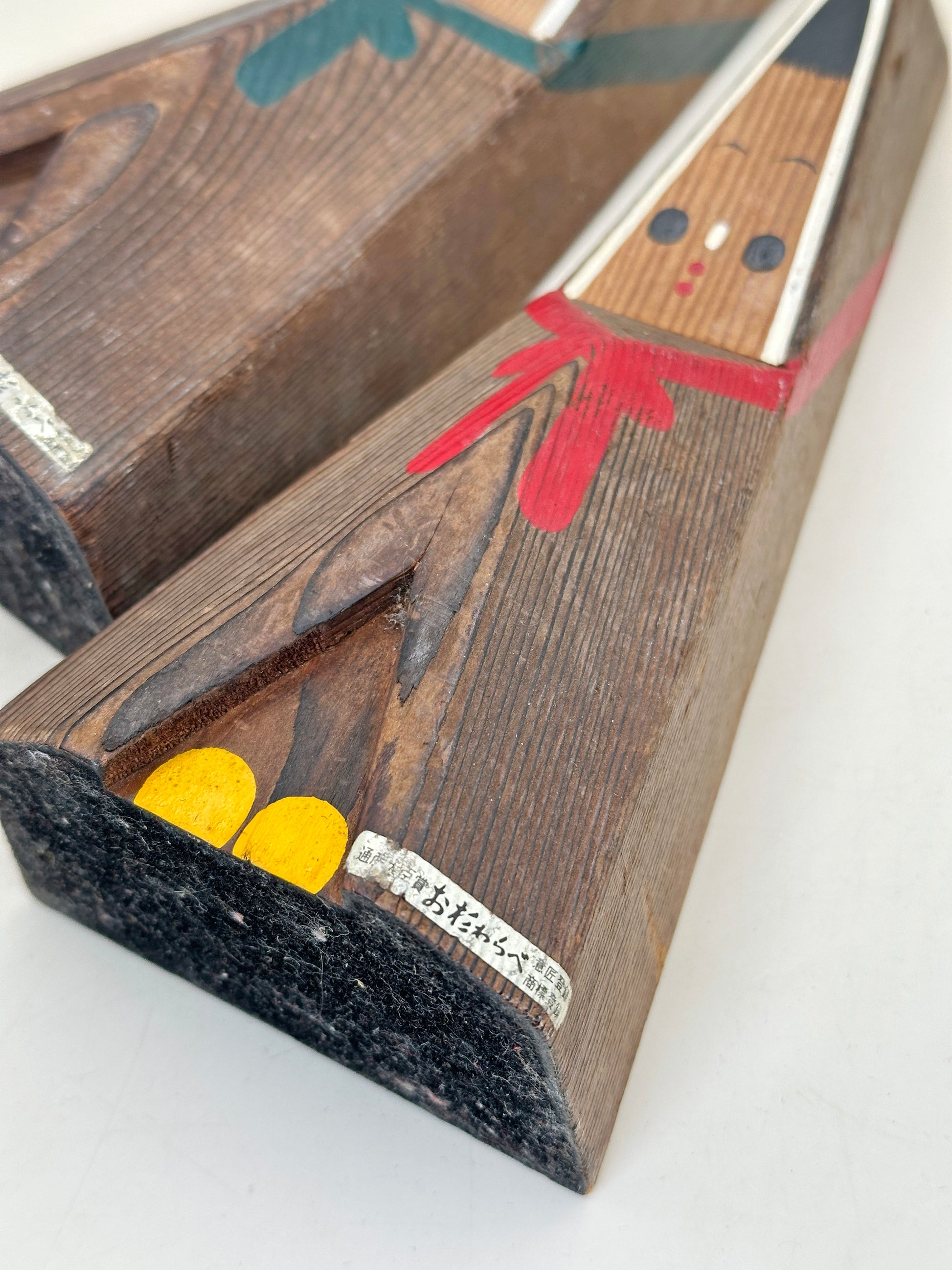 This charming pair of Osugi Warabe お杉わらべ dolls originates from Ōdate City in Akita Prefecture, a region known for its rich woodcraft traditions. These delightful figures depict children bundled in traditional snow hats (kakumaki style coverings), evoking the quiet beauty and warmth of life in Japan’s snowy north.