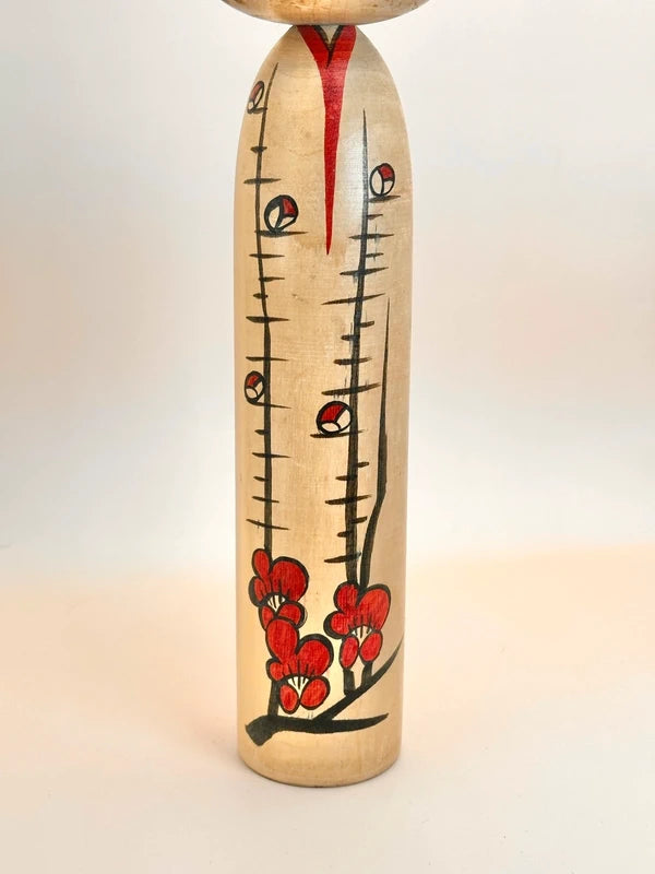 The body is decorated with a striking plum blossom (ume) motif, a seasonal favorite representing resilience and early spring. The red blossoms are arranged along vertical black branches that rise elegantly from the base, each bud outlined with detail and flair. A red collar-like detail at the neck completes the composition, lending balance and warmth to the overall form.