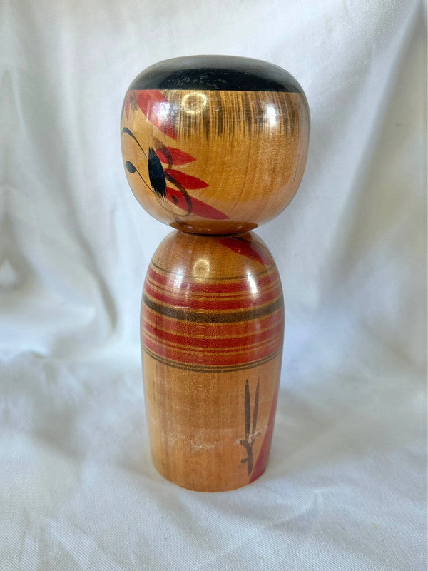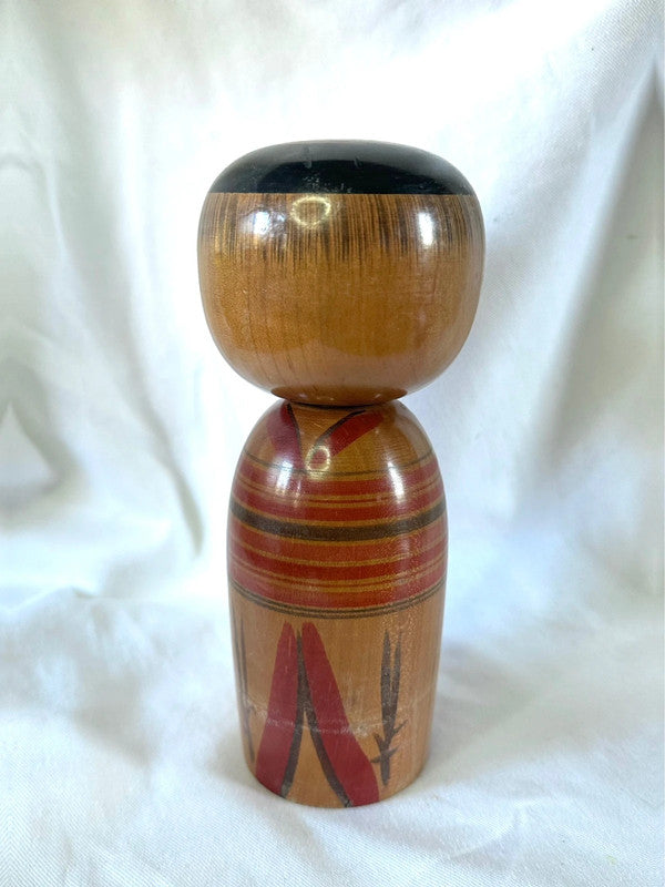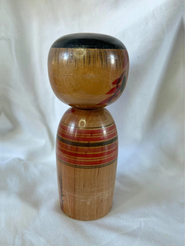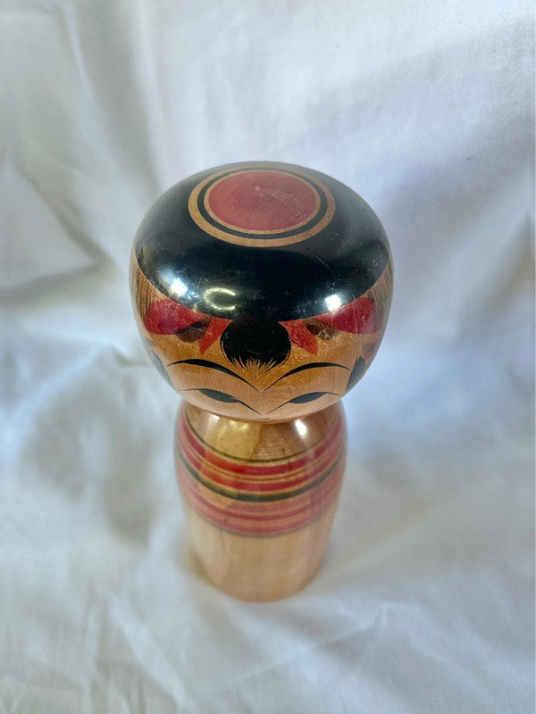 Kokeshi doll by the master Sato Koichi. Yajiro kokeshi is the head with a multi-colored bob or chignon with a Rokoru -Moyo pattern painted on a lathe to create perfectly rendered lines. It has a straight, beautifully painted body. The waist shows line work of different colors to accentuate the simulated obi. The neck and bottom of the doll further simulates a kimono. Her eyes are called Hitoe-Mabuta, (single-lid) with eyebrows, a simple eye drawn with a single curved line with an eyeball underneath.