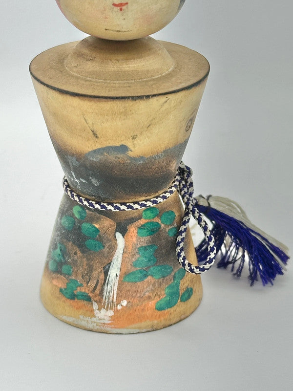 This is a omiyage kokeshi. The doll wears a wide, woven straw hat, giving it a rustic appearance. Its body is a conical shape decorated with hand-painted scenery of waterfalls with earthy tones, resembling a natural landscape. A braided cord with tassels, in purple and white, wraps around the body, adding a decorative touch. This kokeshi combines simplicity and artistry, reflecting traditional Japanese craftsmanship.